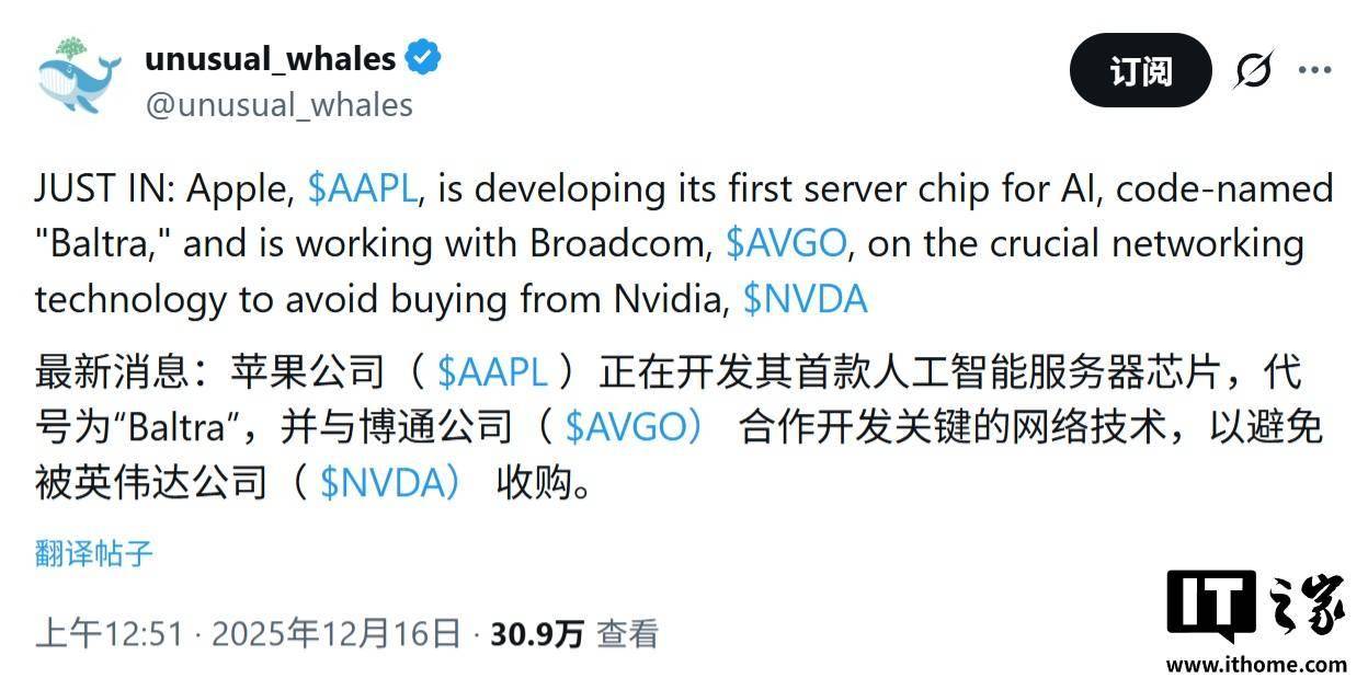 科技媒体 Wccftech 昨日(12 月 15 日)发布博文,报道称苹果正在深化其“垂直整合”战略,不仅在消费电子端发力,更将触角伸向了核心算力基础设施,加速研发代号为“Baltra”的首款自研 AI 服务器芯片。 消息称苹果已启动该自研项目,并选择博通(Broadcom)作为关键合作伙伴,负责攻克核心网络传输技术,预计要等到 2027 年才能正式投入使用,被视为苹果摆脱对英伟达芯片依赖的关键一步。 IT之家援引博文介绍,“Baltra”芯片在设计理念上并未盲目追求全能,而是精准锁定了“AI 推理”(Inference)这一细分赛道。苹果目前并不打算亲自下场训练超大规模 AI 模型,而是选择以每年 10 亿美元的代价,租用谷歌拥有 3 万亿参数的定制版 Gemini 模型来驱动云端“Apple Intelligence”服务。 因此,苹果的自研芯片无需应对模型训练所需的庞大算力消耗,而是将全部性能用于“执行”,即利用已有模型快速处理用户指令,例如根据提示词撰写邮件或处理 Siri 请求。 基于“推理优先”的战略定位,“Baltra”的架构设计将与传统的训练芯片截然不同。训练芯片侧重于海量数据的吞吐与高精度计算,而推理芯片则更强调“低延迟”和“高并发吞吐量”。 据分析,苹果与博通将重点优化芯片的 INT8(8 位整数)等低精度数学运算能力,这不仅能大幅降低能耗,还能显著提升用户端的响应速度。此外,供应链消息指出,该芯片极有可能采用台积电先进的 3nm“N3E”工艺,设计工作预计在未来 12 个月内完成。 该媒体指出,从终端设备到云端服务器,苹果正试图通过掌控每一个核心技术节点,构建起一道难以逾越的竞争壁垒。 苹果正在加速扩展其自研芯片帝国,在外界熟知的 A 系列(iPhone)和 M 系列(Mac)芯片外,积极部署其它芯片,例如 5G 基带芯片 C1,以及 Wi-Fi 和蓝牙芯片 N1 等等,此外有消息称苹果针对未来的 AI 眼镜,搭载 Apple Watch S 系列芯片的衍生版本。