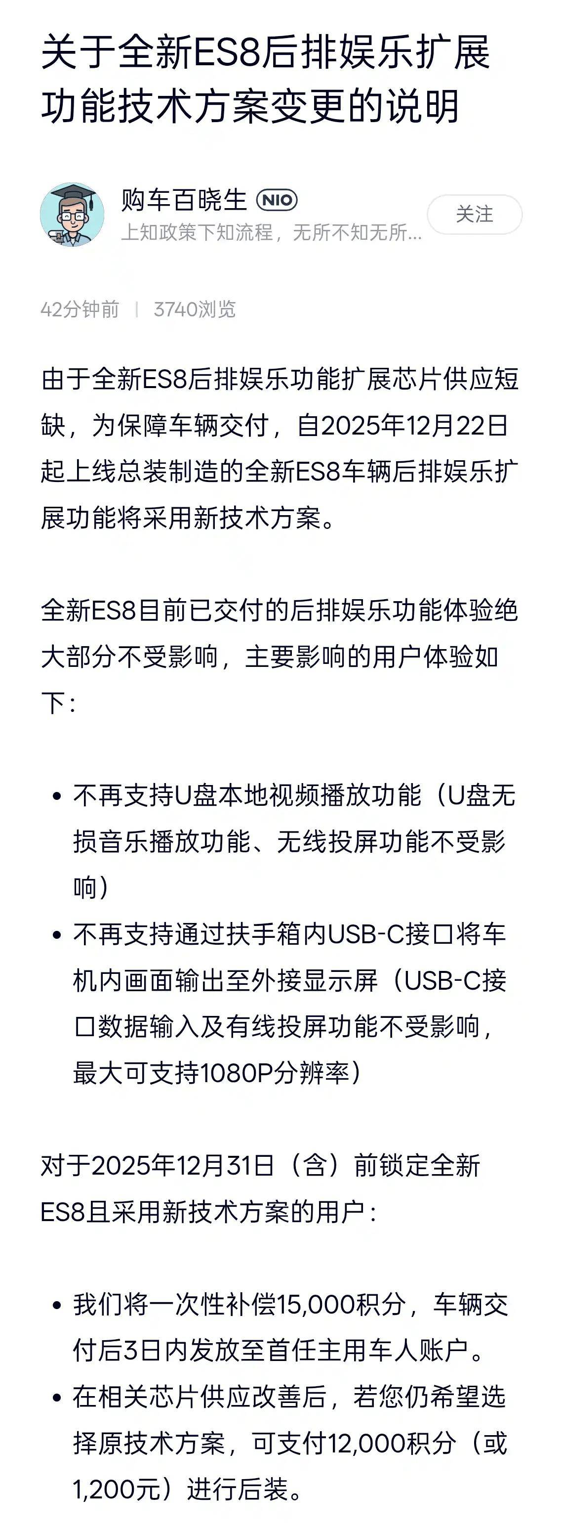 与此同时,对于 2025 年 12 月 31 日(含)前锁定全新 ES8 且采用新技术方案的用户:将一次性补偿 15000 积分,车辆交付后 3 日内发放至首任主用车人账户;在相关芯片供应改善后,若您仍希望选择原技术方案,可支付 12,000 积分(或 1,200 元)进行后装。