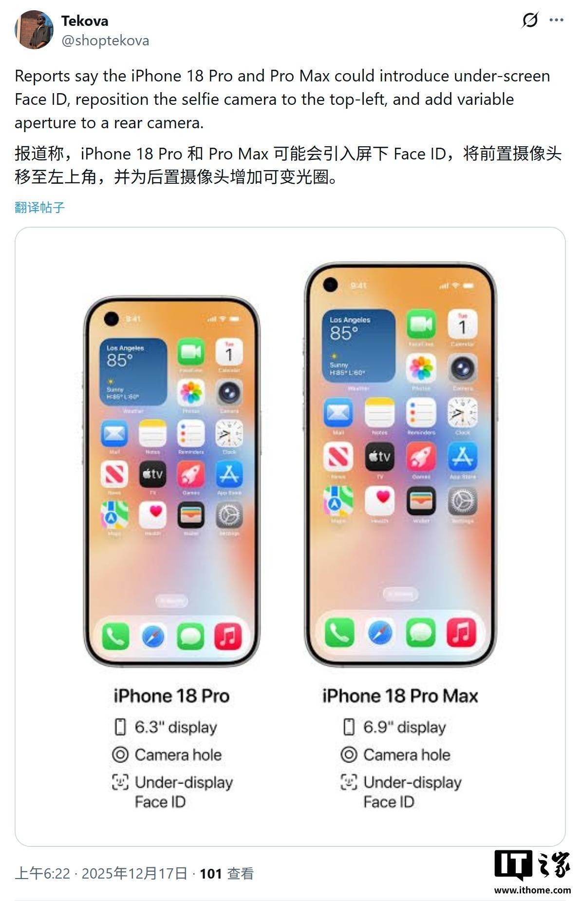 科技媒体 The Information 昨日(12 月 16 日)发布博文,爆料称苹果 iPhone 18 Pro 和 iPhone 18 Pro Max 将迎来重大外观变革,计划彻底摒弃“灵动岛”药丸形挖孔,转而采用左上角单打孔前置镜头与屏下 Face ID 技术。