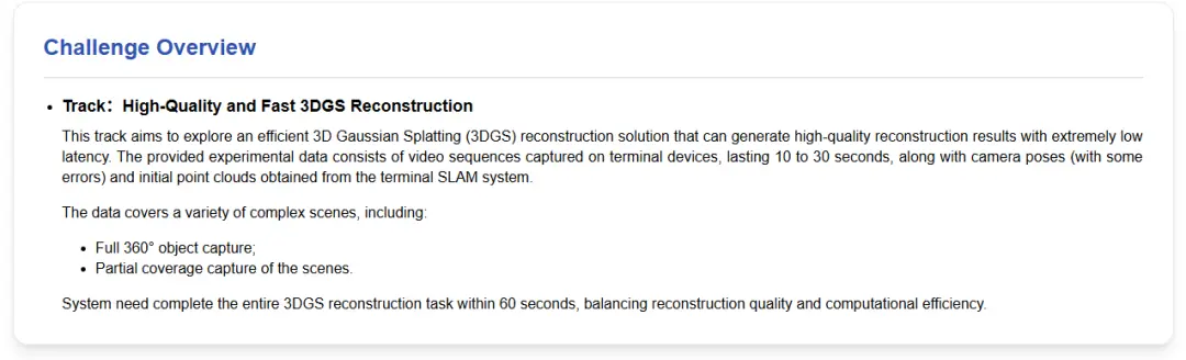 极致挑战 60秒高质量重建,走向实用化临界点 本次竞赛为参赛团队设置了极具挑战性的任务: