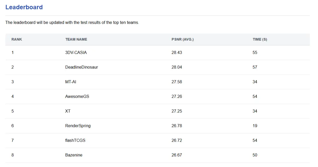 主办方以PSNR(重建质量)与重建速度为综合评价指标,力求在完全公开、公正的条件下得出权威排名。