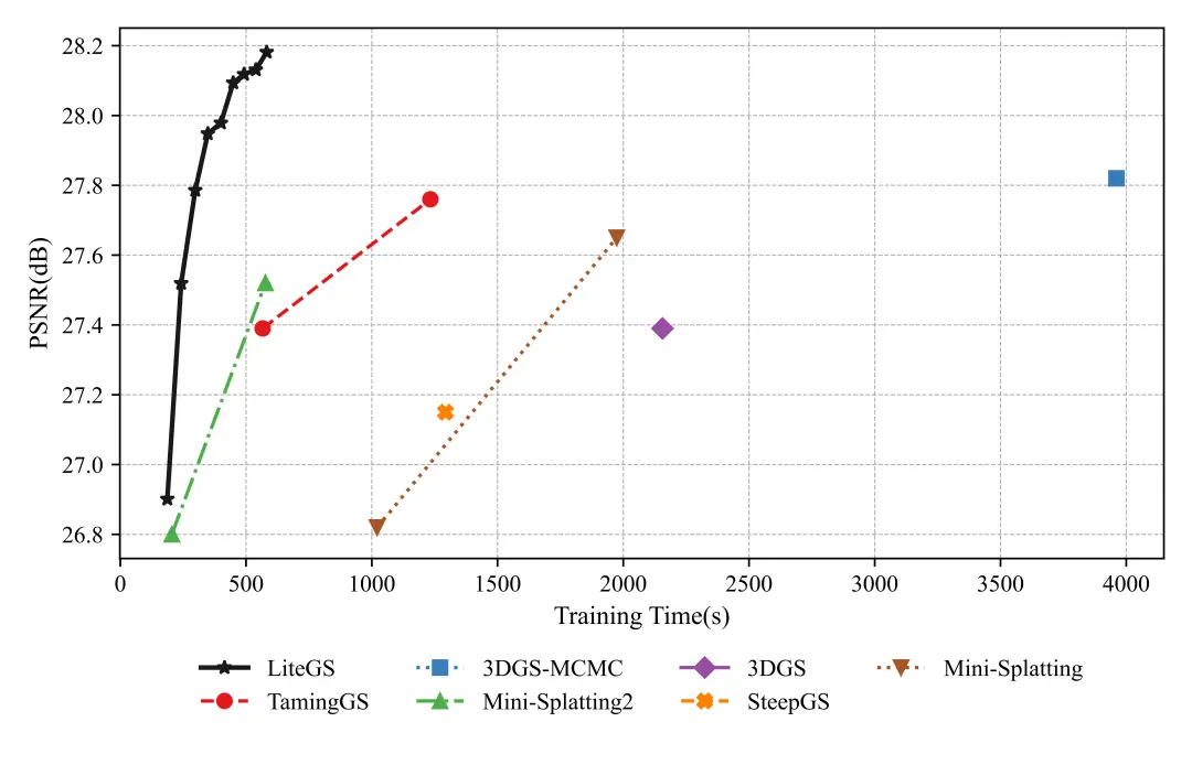 在相同参数量下,LiteGS在PSNR指标上超出主流方案0.2-0.4 dB,训练时间缩短3.8至7倍。