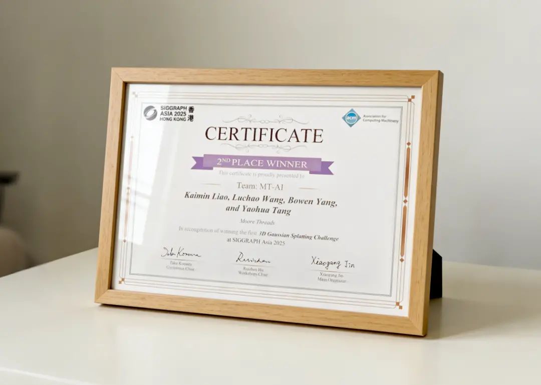 凭借行业领先的3DGS 算法构建能力与软硬件协同优化优势,摩尔线程最终获得二等奖(银牌)的优秀成绩。