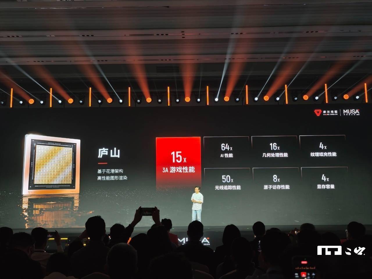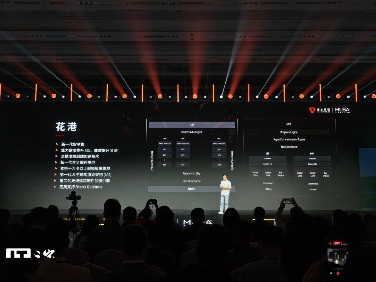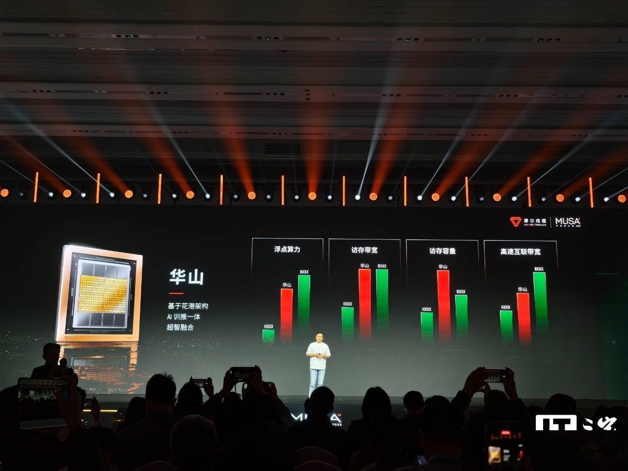 摩尔线程今天举行 MUSA 开发者大会,发布全新“花港”架构以及 MUSA 5.0 全栈软件升级,并发布“华山”、“庐山”两款芯片,分别主打 AI 推理训练一体、高性能图形渲染场景。 据介绍,“华山”是花港架构的第一款芯片,主打 AI 训推一体、超智融合,在浮点算力、访存带宽、访存容量、高速互联带宽方面均有提升,内置新一代异步编程技术,内置异步编程模型,具备高效线程同步、线程束特化等特性。 具体来说,“华山”芯片具备新一代张量计算引擎,拥有 TF32/FP16/INT8 等全精度 MMA,可大幅度提升 FP6/FP4 的张量运算性能,新增 TCE-PAIR 模式,增强内部数据重用,还配备 MTFP8/6/4 混合低精度计算技术,兼容 MXFP 和 NVFP。 IT之家从发布会现场了解到,“华山”芯片还可应用于超十万卡级 AI 工厂,搭载新一代 Scale-up 系统,兼容 MTLink 4.0 和多种以太协议,适配多种 Scale-up switch,支持 SHARP,片间互联速率可达 1314 GB/s。 而“庐山”则是花港架构的第二款芯片,主打高性能图形渲染场景,得益于花港架构的新一代指令集,算力密度提升 50%,能效提升 10 倍,内置第一代 AI 生成式渲染架构(AGR)、第二代光追硬件加速引擎,完美支持 DirectX 12 Ultimate。 值得注意的是,“庐山”芯片还拥有 AI 计算加速引擎,可与几何 / 网格着色器、像素着色器、光追材质着色器等进行互联,配备 UNITE 渲染架构,可优化任务分配、平衡和同步。 值得注意的是,花港架构还配备全新设计的光线追踪硬件加速引擎,支持硬件加速光线全场景遍历求交,相比最早的春晓架构性能提升 50 倍。 此外,搭载“华山”和“庐山”芯片的全新硬件产品将在明年亮相,IT之家将持续关注,在第一时间带来最新消息。