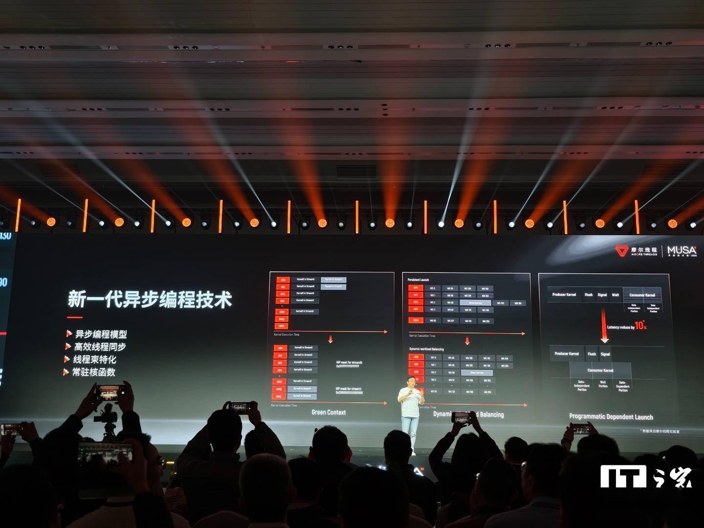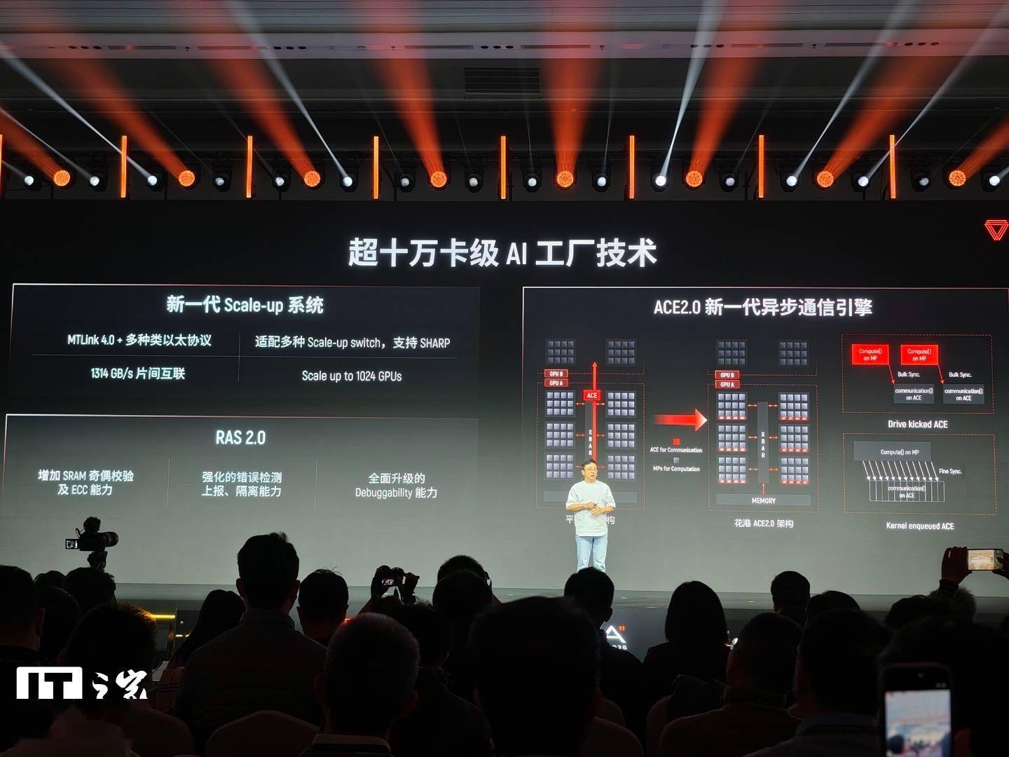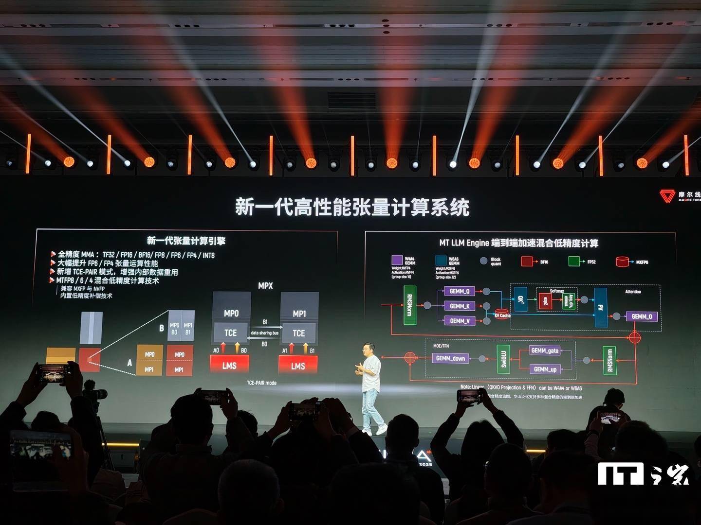 摩尔线程今天举行 MUSA 开发者大会,发布全新“花港”架构以及 MUSA 5.0 全栈软件升级,并发布“华山”、“庐山”两款芯片,分别主打 AI 推理训练一体、高性能图形渲染场景。 据介绍,“华山”是花港架构的第一款芯片,主打 AI 训推一体、超智融合,在浮点算力、访存带宽、访存容量、高速互联带宽方面均有提升,内置新一代异步编程技术,内置异步编程模型,具备高效线程同步、线程束特化等特性。 具体来说,“华山”芯片具备新一代张量计算引擎,拥有 TF32/FP16/INT8 等全精度 MMA,可大幅度提升 FP6/FP4 的张量运算性能,新增 TCE-PAIR 模式,增强内部数据重用,还配备 MTFP8/6/4 混合低精度计算技术,兼容 MXFP 和 NVFP。 IT之家从发布会现场了解到,“华山”芯片还可应用于超十万卡级 AI 工厂,搭载新一代 Scale-up 系统,兼容 MTLink 4.0 和多种以太协议,适配多种 Scale-up switch,支持 SHARP,片间互联速率可达 1314 GB/s。 而“庐山”则是花港架构的第二款芯片,主打高性能图形渲染场景,得益于花港架构的新一代指令集,算力密度提升 50%,能效提升 10 倍,内置第一代 AI 生成式渲染架构(AGR)、第二代光追硬件加速引擎,完美支持 DirectX 12 Ultimate。 值得注意的是,“庐山”芯片还拥有 AI 计算加速引擎,可与几何 / 网格着色器、像素着色器、光追材质着色器等进行互联,配备 UNITE 渲染架构,可优化任务分配、平衡和同步。 值得注意的是,花港架构还配备全新设计的光线追踪硬件加速引擎,支持硬件加速光线全场景遍历求交,相比最早的春晓架构性能提升 50 倍。 此外,搭载“华山”和“庐山”芯片的全新硬件产品将在明年亮相,IT之家将持续关注,在第一时间带来最新消息。