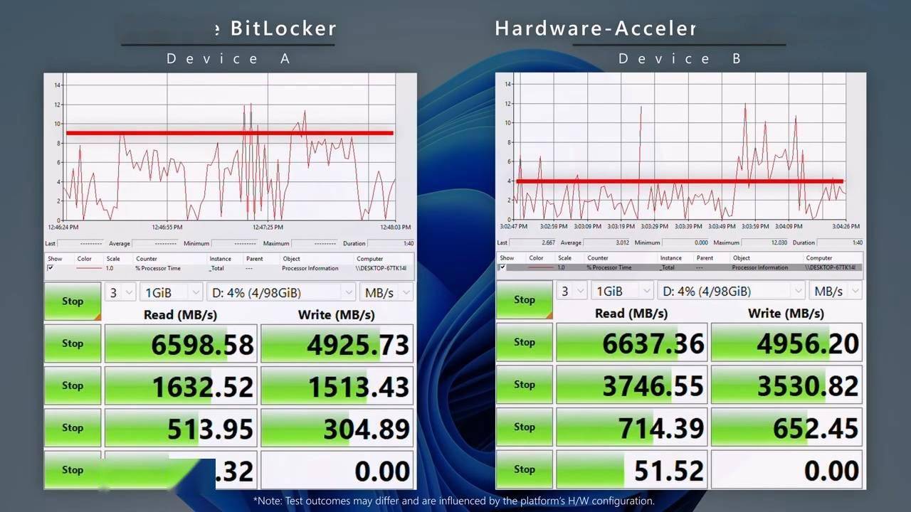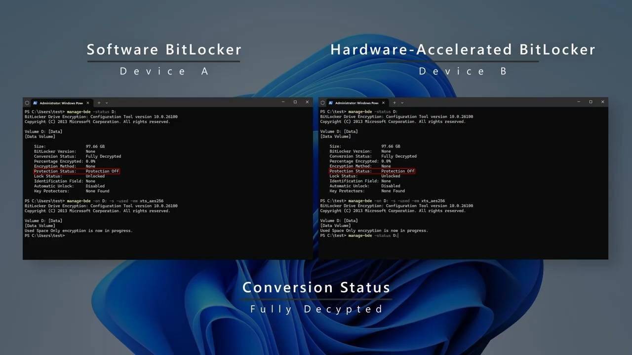 微软今天(12 月 20 日)发布博文,为解决高性能 NVMe SSD 加密时的 CPU 瓶颈问题,推出“硬件加速 BitLocker”技术,存储设备的读写性能几乎可以媲美未加密状态下的原生 NVMe 速度。 信息图对比了软件版 BitLocker 和硬件加速版 BitLocker。 更关键的突破在于能效比:相比传统软件加密,硬件加速 BitLocker 平均能节省 70% 的 CPU 周期。这意味着 CPU 可以更专注于处理用户的高频应用,同时显著降低整机功耗,为笔记本电脑用户带来更持久的电池续航体验。 硬件加速的 BitLocker 相比软件 BitLocker 平均可节省 70% 的 CPU 周期资源,节省的 CPU 资源可以延长电池续航时间。 IT之家注:CPU 周期(也称机器周期)是 CPU 完成一个基本操作(如取指令、读内存、写内存等)所需的时间单位,它由多个更小的时钟周期组成,而时钟周期是 CPU 内部时钟跳动一次的时间,是 CPU 最基本的计时单位。 视频对比了软件版 BitLocker 和硬件加速版 BitLocker。 对比了软件版 BitLocker 和硬件加速版 BitLocker 除了性能提升,新功能在安全性上也构建了更坚固的防线。硬件加速 BitLocker 支持“硬件保护密钥”技术,当 SoC 硬件条件满足后,BitLocker 的批量加密密钥将被直接封装在硬件中,而非暴露于 CPU 或内存。 这一机制加上现有的 TPM(可信平台模块)保护,极大地降低了密钥被恶意软件从内存中窃取或遭受侧信道攻击的风险。 命令行界面显示加密方式为硬件加速的 BitLocker。 微软表示自 2025 年 9 月开始,通过 Windows 11 24H2 更新及后续的 25H2 版本正式推送该功能。首发支持的硬件平台确认为搭载英特尔酷睿 Ultra 3 系列(代号 Panther Lake)处理器的设备,后续将扩展至更多厂商平台。