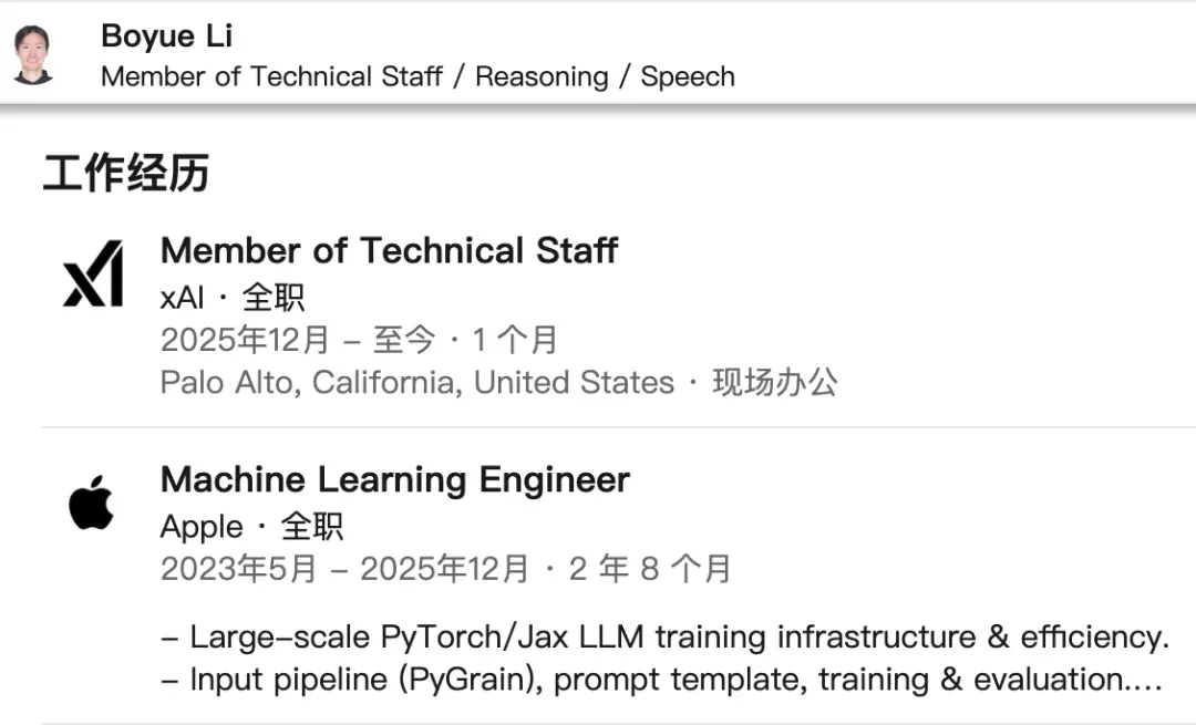 就在这个月,Li离开工作近3年的苹果,加入马斯克旗下的xAI。