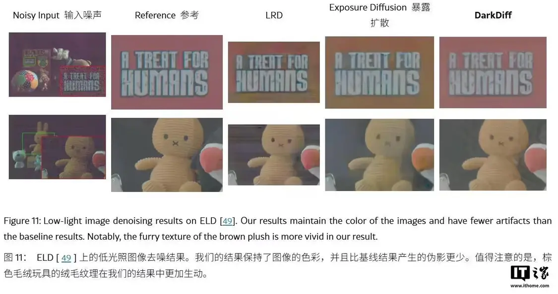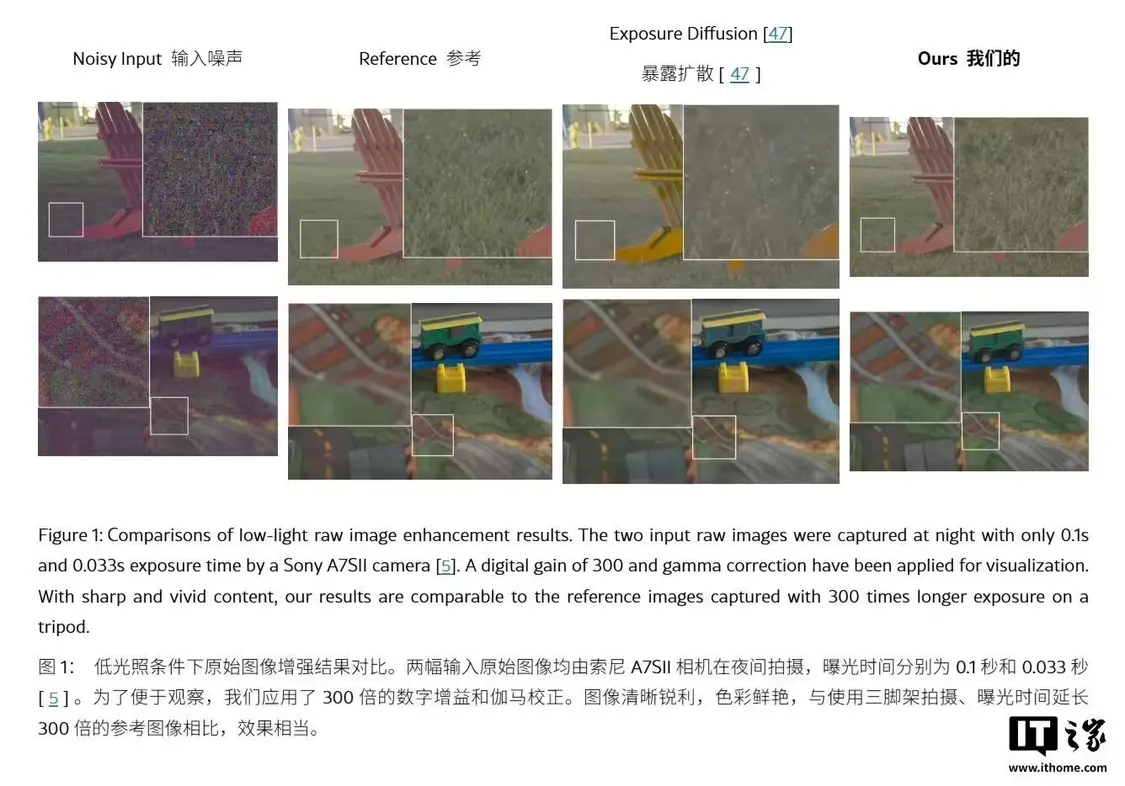 研究人员为了验证效果,使用了索尼 A7SII 相机在极暗环境下拍摄测试样本,曝光时间短至 0.033 秒。将 DarkDiff 处理后的图像与使用三脚架长曝光(时长为测试图 300 倍)拍摄的参考图进行对比,结果显示 DarkDiff 在色彩还原和细节清晰度上均优于现有的 Raw 增强模型。