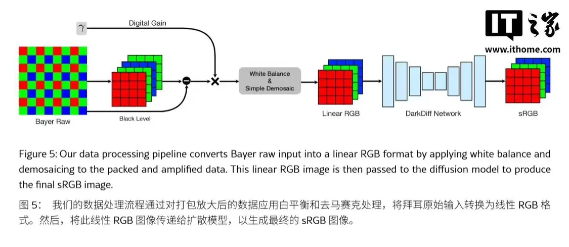 ISP 负责白平衡和去马赛克等基础处理,生成线性 RGB 图像后,DarkDiff 随即接手进行降噪和细节生成。这种深度集成,让 AI 能够理解照片在黑暗区域应有的纹理细节,而非简单地模糊像素。