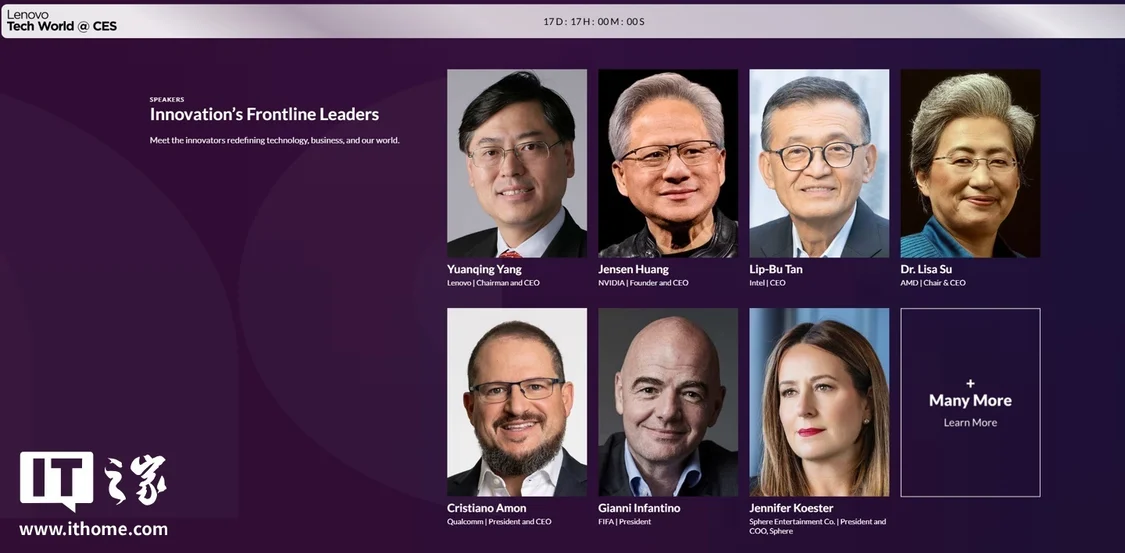 除此之外,联想官网显示英伟达创始人兼 CEO 黄仁勋、英特尔 CEO 陈立武、AMD 董事长兼 CEO 苏姿丰、高通总裁兼 CEO 克里斯蒂亚诺・安蒙、FIFA 主席詹尼・因凡蒂诺、Sphere 总裁兼首席运营官 Jennifer Koester、微软执行副总裁 Yusuf Mehdi、摩托罗拉软件产品营销主管 Angelina Gomez 等人将会亮相并发表演讲。