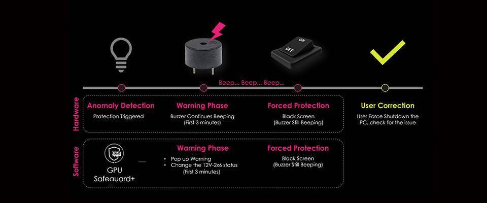 微星昨日(1 月 7 日)发布新闻稿,在 CES 2026 展会期间,展示了 GPU Safeguard 及 Safeguard+ 技术,旨在防止 RTX 5090 等高功耗显卡因 12V-2x6 接口电流异常而发生熔毁。 IT之家援引官方新闻稿,该技术通过单引脚电压监测(per-in-voltage monitoring)实现,实时监测 12V-2x6 接口的电流波动,在系统检测到电流异常时,电源本体会立即启动蜂鸣器发出刺耳警报。 对于搭载 GPU Safeguard+ 进阶版技术的电源,系统还会通过 MSI Center 软件在屏幕上同步弹出警告窗口。微星强调,这是一种主动防御机制,能在大电流导致接口过热熔毁前争取宝贵的处理时间。 若用户在警报响起后的三分钟内未采取行动,电源将自动采取强制措施:让系统进入“黑屏”状态。这一操作并非系统崩溃,而是为了强制降低显卡负载,减少热量堆积,同时蜂鸣器会持续鸣叫。 微星明确表示,无论处于警报阶段还是黑屏阶段,唯一安全的解除方式是立即关闭电脑电源,拔下显卡上的 12V-2x6 接头检查是否有损坏,确认无误后重新插紧。 该技术目前覆盖微星四款最新电源产品。旗舰级 MPG Ai1600TS 和 MPG Ai1300TS PCIE5 电源配备了功能更全的 GPU Safeguard+(支持弹窗 + 蜂鸣);而主流级 MAG A1200PLS 和 MAG A1000PLS PCIE5 电源则搭载标准版 GPU Safeguard(仅蜂鸣)。两者核心保护逻辑一致,区别仅在于是否提供可视化的软件弹窗提醒。 以上图源:微星官网