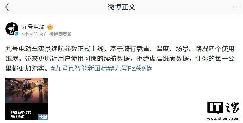 九号电动官方微博今日宣布,九号电动车实景续航参数正式上线,基于骑行载重、温度、场景、路况四个使用维度,可提供更贴近用户使用习惯的续航数据,宣称“拒绝虚高纸面数据”。 九号电动官方表示,理论续航是“实验室里的理想答案”,它并非不靠谱,只是测试环境以理想状态为标准,测试条件:温度恒定 25℃(舒适常温)、标准载重 75kg;行驶状态:25km/h 稳态匀速行驶,无加减速波动;测试场景:底盘测功机恒定滚阻,无真实路况干扰。 而九号「实景续航」标准为:载重:覆盖 50kg-85kg,适配不同体重用户,贴近日常载人 / 载物需求;温度:横跨 0℃-25℃,兼顾冬季低温与常温场景;模拟真实驾驶:每 1 公里 1 次满把加速 + 刹停,还原城市通勤启停频繁场景;全路况覆盖:柏油、砂石、水泥路面混合测试,复刻不同路面滚阻差异。 据IT之家此前报道,九号公司去年 12 月在江苏常州举办 2026 经销商大会,CEO 王野表示,公司未来核心战略聚焦智能化、电动化及全球化。产品规划上,2026 年九号新品将全系标配智驾系统和自主研发的 Nimble OS 操作系统。 另外,截至 2025 年 9 月,九号电动车在中国市场累计出货量已突破 900 万台。此外,公司宣布将启动“Ninebot 九号”与“Segway 赛格威”双品牌协同战略,其华东、华南双基地计划于 2026 年同步运营。