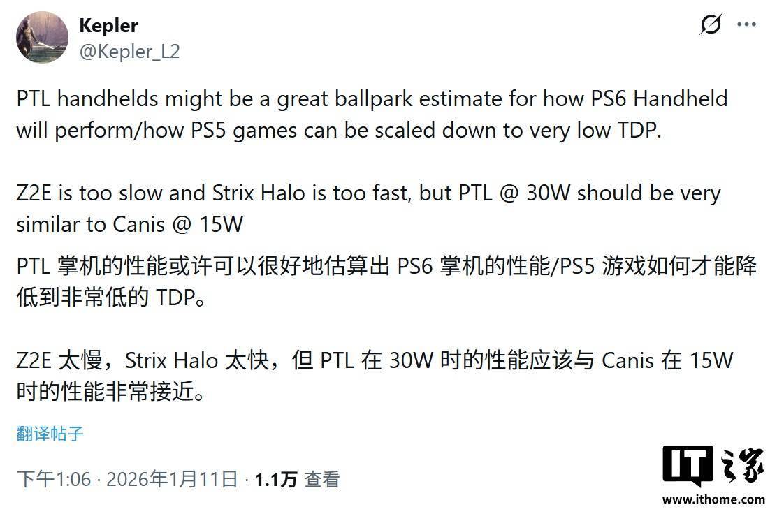 Kepler_L2 于 1 月 11 日在 X 平台发布推文,爆料称英特尔 Panther Lake 掌机需在 30W 功耗下,才能达到索尼 PS6 掌机(代号为 Canis)在 15W 功耗下的性能水平。 英特尔在 CES 2026 展会期间,官宣将通过 Panther Lake SoC 芯片,全力投入游戏掌机生态。不同于以往 Meteor Lake 和 Lunar Lake 仅作为通用芯片用于掌机,Panther Lake 将包含专为掌机细分市场设计的专用型号。 IT之家援引博文介绍,英特尔为提升掌机体验,计划对 Panther Lake 芯片进行针对性“瘦身”。该系列预计将剔除 NPU(神经网络处理单元)等对纯游戏场景非必要的模块,从而释放更多芯片面积和功耗预算,腾出的空间将用于搭载更多高能效的 Xe3 图形核心以及数量适宜的 CPU 核心。 这种设计思路旨在让芯片在有限的功耗下全速运行,将所有硬件资源集中转化为游戏帧数,以解决此前产品在能效比上不及竞争对手的痛点。 Kepler_L2 透露,英特尔 Panther Lake 掌机在性能上将能够匹敌索尼即将推出的 PS6 掌机(代号 Canis)。然而,两者在能效上存在显著差距:Panther Lake 需要 30W 的热设计功耗(TDP)才能达到 PS6 掌机在 15W 下的性能表现。