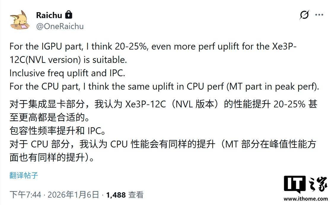 OneRaichu 于 1 月 6 日在 X 平台发布推文,称英特尔 Nova Lake 处理器将搭载 Xe3P 架构核显,性能预估比 Panther Lake 的 Xe3 架构提升 20~25%。 为理解这一提升幅度的含金量,需回顾 Xe3 架构的现有表现。英特尔此前展示的 Panther Lake 处理器(搭载 Xe3 架构 Arc B390 核显)在 1080p 原生渲染测试中,平均性能比 AMD Radeon 890M 快 82%,甚至在特定功耗下拥有媲美 60W 版 RTX 4050 独立显卡的实力。 如果 Xe3P 能在此基础上再提升 25%,Nova Lake 将极大改变轻薄本与迷你主机的游戏体验,成为名副其实的“游戏级”处理器。 除了单纯的性能提升,Nova Lake 在架构设计上也可能迎来颠覆性创新。IT之家援引博文介绍,Nova Lake 或将成为首款采用“混合核显架构”的 CPU:其 3D 图形计算部分采用 Xe3P 架构,而媒体解码与显示引擎则可能率先采用更先进的 Xe4 架构。 @OneRaichu 还指出,Xe3P 架构不仅将应用于 Nova Lake 的核显(iGPU),还可能赋能未来的独立显卡(dGPU),覆盖桌面与移动双平台。