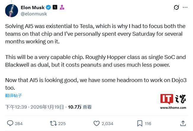 马斯克从侧面证实 AI5 芯片在开发历程中遇到了一些困难,故此前集中了车用与数据中心 AI 芯片开发团队的人力资源进行攻关,他本人也为此连续数月进入周末单休模式。而由于 AI5 现在表现良好,Dojo 3 的开发也重新启动。