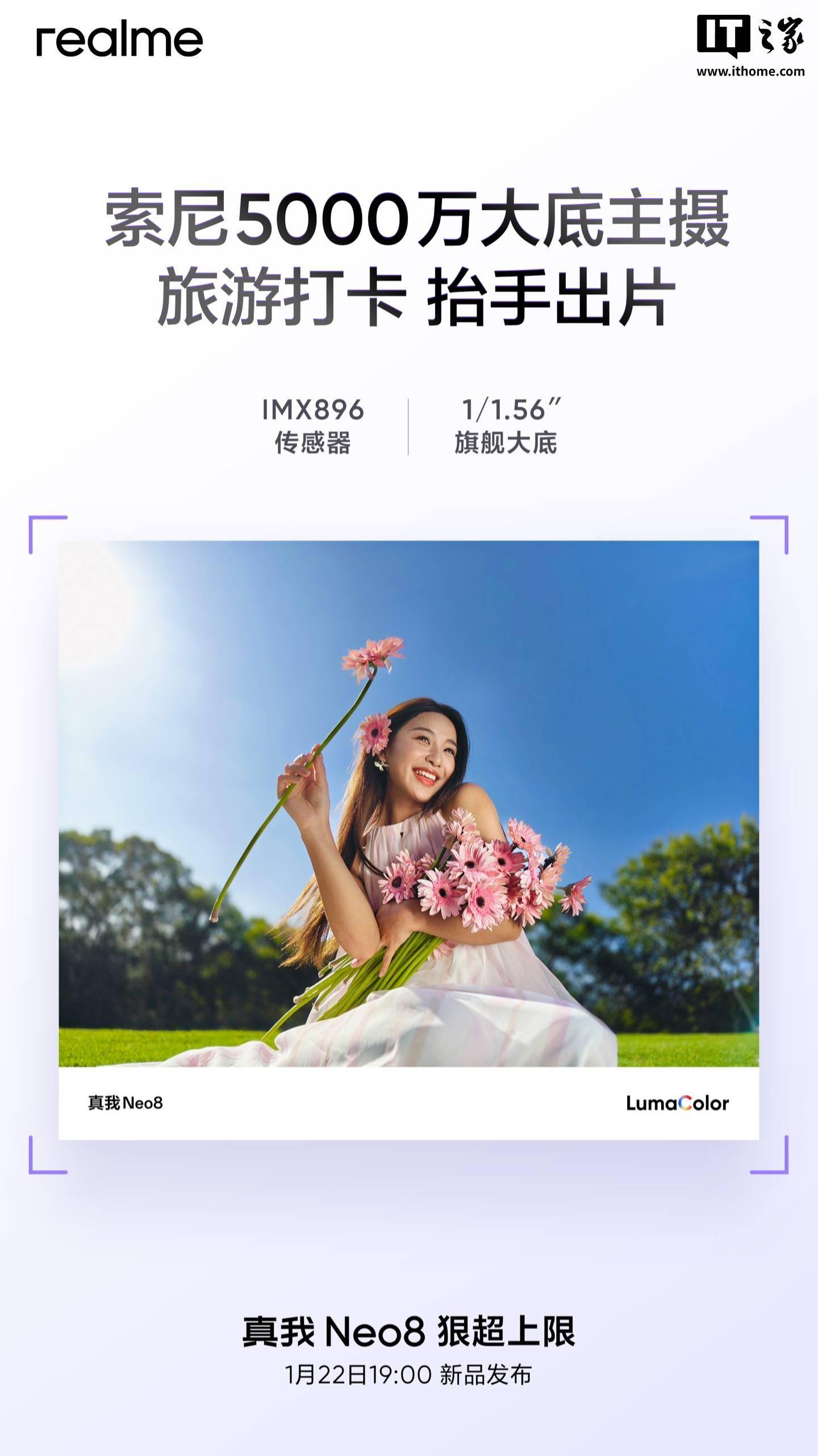 realme 真我手机今日正持续预热真我 Neo8,新机确认搭载索尼 5000 万像素大底主摄:采用 IMX896 传感器,拥有 1/1.56'' 旗舰大底。 IT之家注意到,realme 真我 Neo8 手机还搭载“同档罕见”5000 万潜望长焦,支持 3.5 倍光学变焦 + 7 倍无损变焦 + 至高 120 倍超级变焦,自带 OIS 光学防抖。官方样张对比如下: realme 真我 Neo 8 手机将于 1 月 22 日晚 19:00 正式发布,主要配置如下: - 第五代骁龙 8 x 极客性能面板:超 358 万跑分,首发自定义温控调节