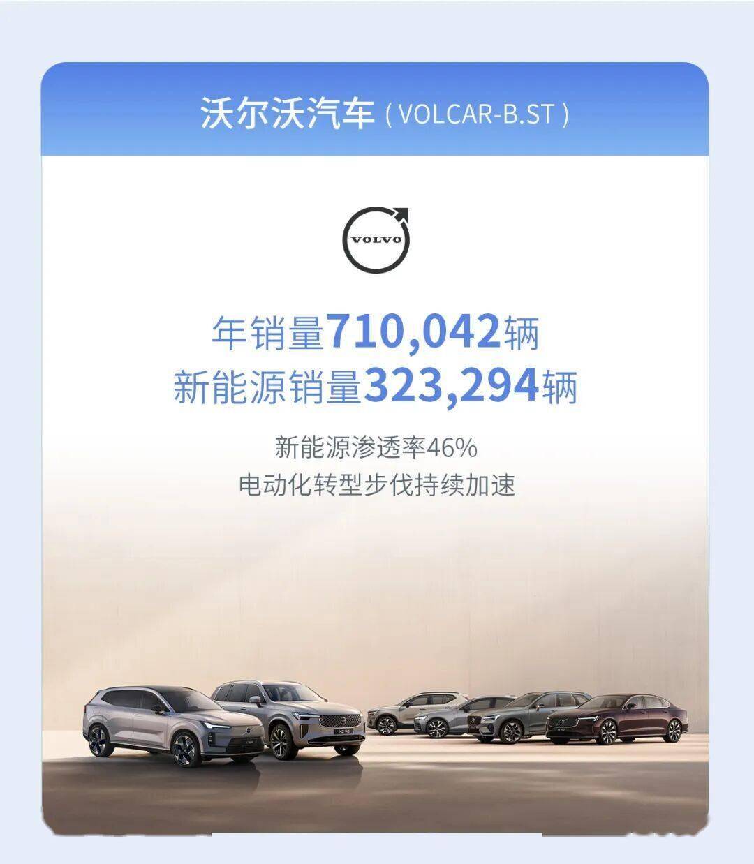 - 沃尔沃汽车 710042 辆,新能源销量 323294 辆,新能源渗透率 46%。