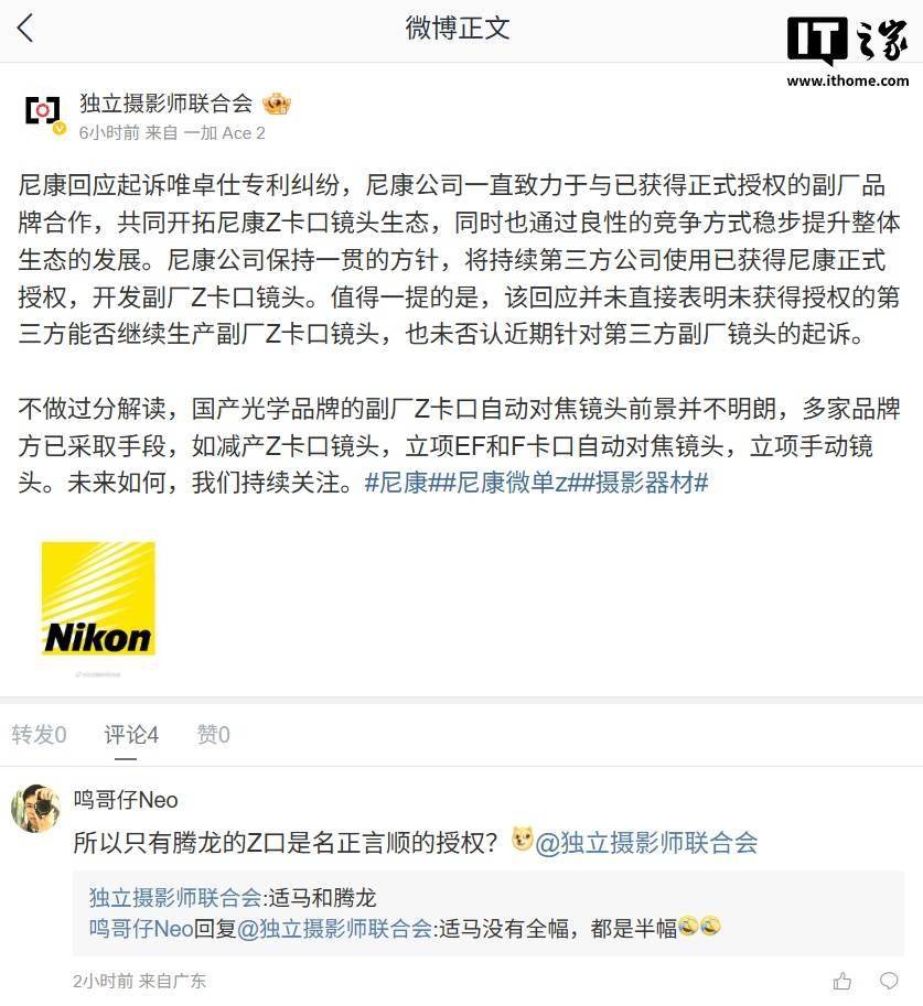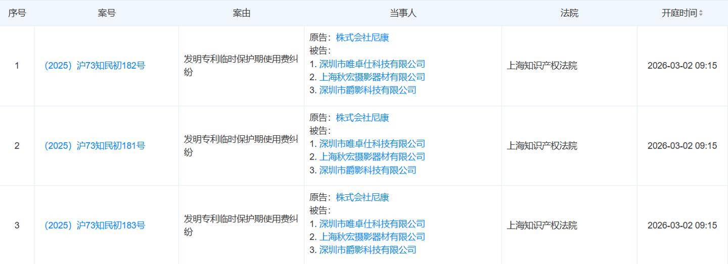 多家企业查询平台显示,尼康本月在上海知识产权法院起诉深圳市唯卓仕科技有限公司、深圳市爵影科技有限公司、上海秋宏摄影器材有限公司,案由为“发明专利临时保护期使用费纠纷”,三起案件将于 3 月 2 日开庭。 唯卓仕是一家国产镜头厂商,目前推出了多款尼康 Z 卡口的镜头产品。IT之家查询发现,“深圳市爵影科技有限公司”则是唯卓仕官网的关联公司。 据博主 @独立摄影师联合会 今日消息,尼康回应起诉唯卓仕专利纠纷,尼康公司一直致力于与已获得正式授权的副厂品牌合作,共同开拓尼康 Z 卡口镜头生态,同时也通过良性的竞争方式稳步提升整体生态的发展。尼康公司保持一贯的方针,将持续第三方公司使用已获得尼康正式授权,开发副厂 Z 卡口镜头。 该博主还称,国产光学品牌的副厂 Z 卡口自动对焦镜头前景并不明朗,多家品牌方已采取手段,如减产 Z 卡口镜头,立项 EF 和 F 卡口自动对焦镜头,立项手动镜头。