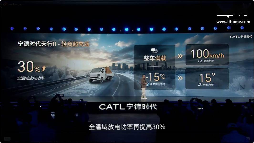 宁德时代今日发布了天行 II 轻商系列动力电池,提供全场景定制化系列解决方案。 IT之家注意到,其中轻商低温版采用行业首款量产钠电池。据公司业务负责人介绍,该款钠电池 45 度电匹配中小 VAN、小微卡多种车型,在零下 30℃ 电芯完全冻透下,可即插即充;在零下 40℃,电池依然保有 90% 可用电量。 同期发布的还有城配运输场景-轻商超充版,城际干线场景-轻商长续航版和末端城配 & 自备场景-轻商高温超充版等,以及轻商换电版。