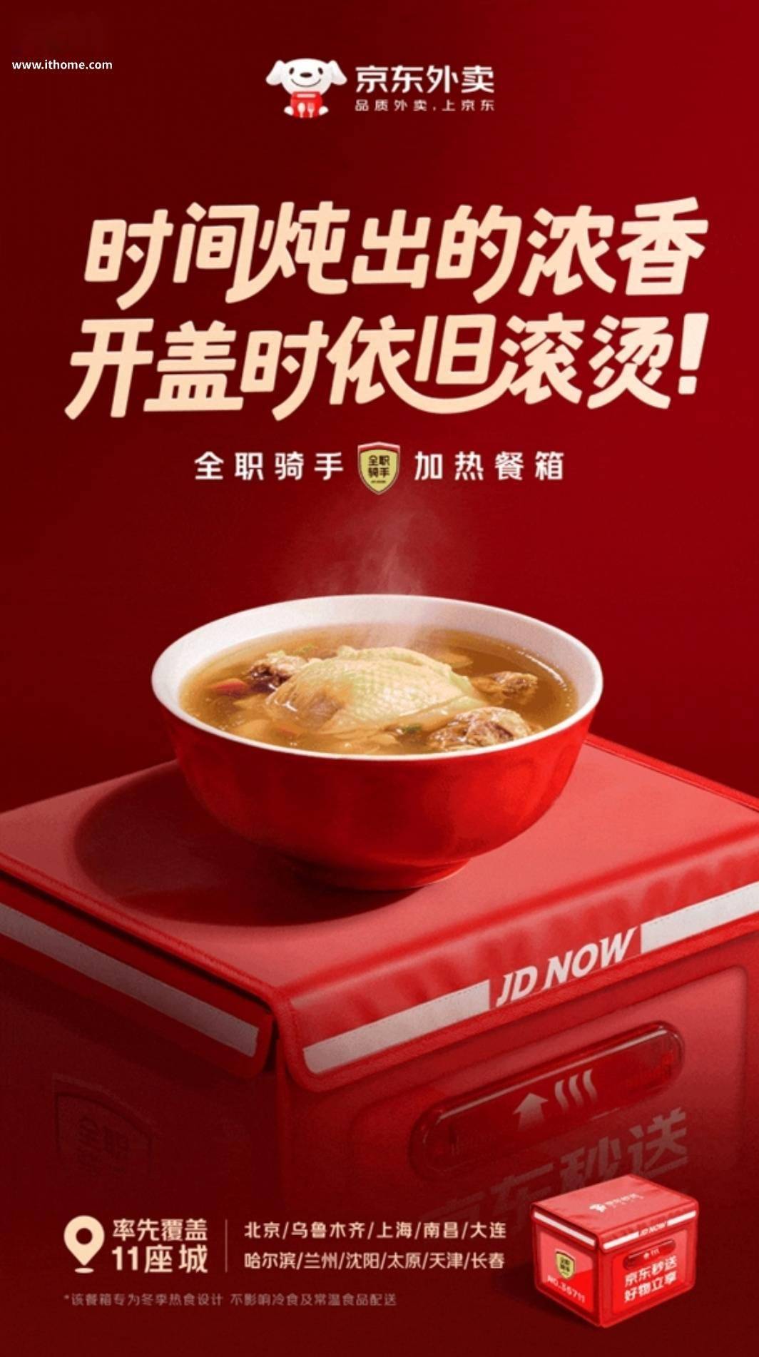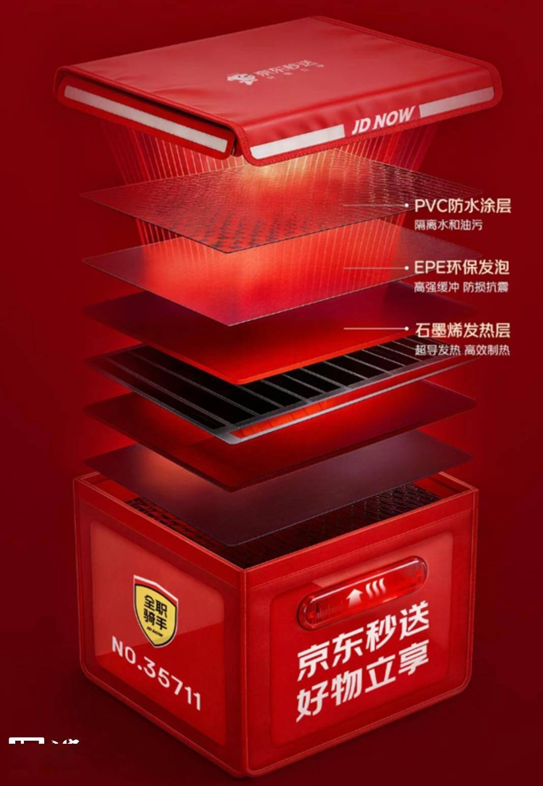 京东外卖宣布将为全职骑手免费配置加热餐箱,目前已经落地北京、上海、乌鲁木齐、南昌,本周将陆续覆盖哈尔滨、长春、沈阳、大连、太原、兰州、天津,合计共 11 座城市。这些城市的京东外卖订单,将优先召唤餐箱加热骑手,用户可以在订单配送页看到对应服务。 据介绍,相应加热餐箱号称“硬核科技升温 20°C”,箱体采用三层结构,分别是 PVC 防水涂层、EPE 环保发泡、石墨烯发热层,发热层可释放 8-15um 远红外线,与太阳光热波长接近,水分子运动更柔和,热得均匀。 京东外卖称,将两份初始温度 70℃ 的辣椒炒肉分别放入普通餐箱和京东外卖加热餐箱,在相同路线下模拟远距离配送,20 分钟后加热餐箱内温度依旧稳定在 70℃,比普通餐箱足足高出 20℃。经过测试,就算是 60 分钟以上的超远距离配送,餐箱温度仍能保持在 55℃ 以上。