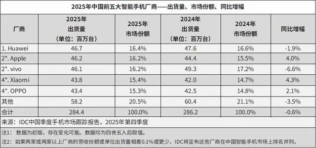 2025年四季度,华为手机出货量排名第四,同比下降10.3%。