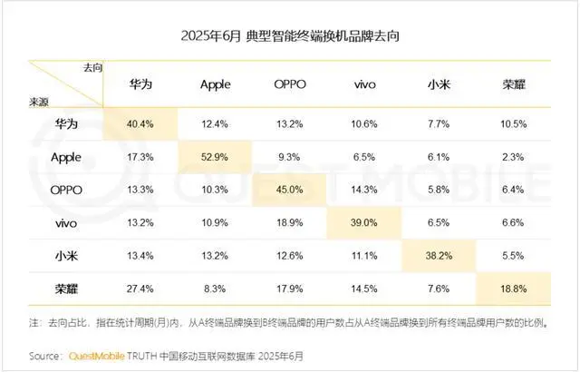 2025年6月,Quest Mobile曾发布一份数据,从品牌忠诚度的角度来看,华为用户的忠诚度较高,仅次于苹果和OPPO,品牌回购比例超过四成,荣耀用户中有27.4%在换机时选择华为。