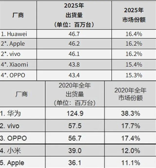 2025年、2020年华为全年手机出货量及市场份额,来源:IDC 随着芯片供应逐渐稳定,甚至有数码博主大胆预测:2026年华为和苹果的全方位厮杀即将开始,高端局其他人上不了桌。