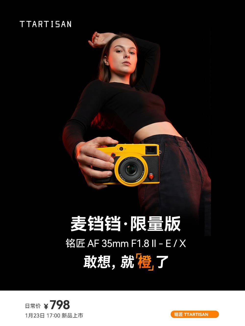 铭匠光学今日宣布推出全新的 AF 35mm F1.8 II 麦铛铛限量版 APS-C 自动对焦镜头,采用明亮的橙色外观,适用于索尼 E 卡口及富士 X 卡口,首发价 740 元(日常价 798 元)。 IT之家汇总参数如下: - 焦段:35mm