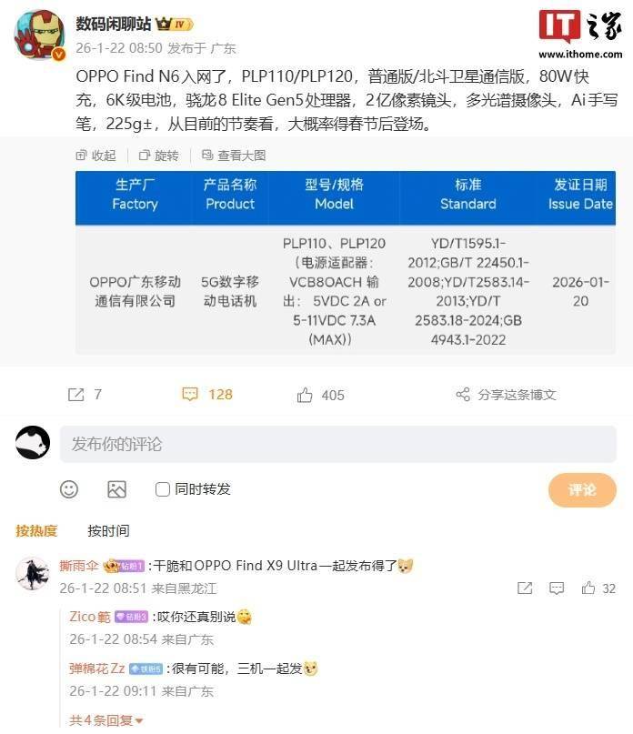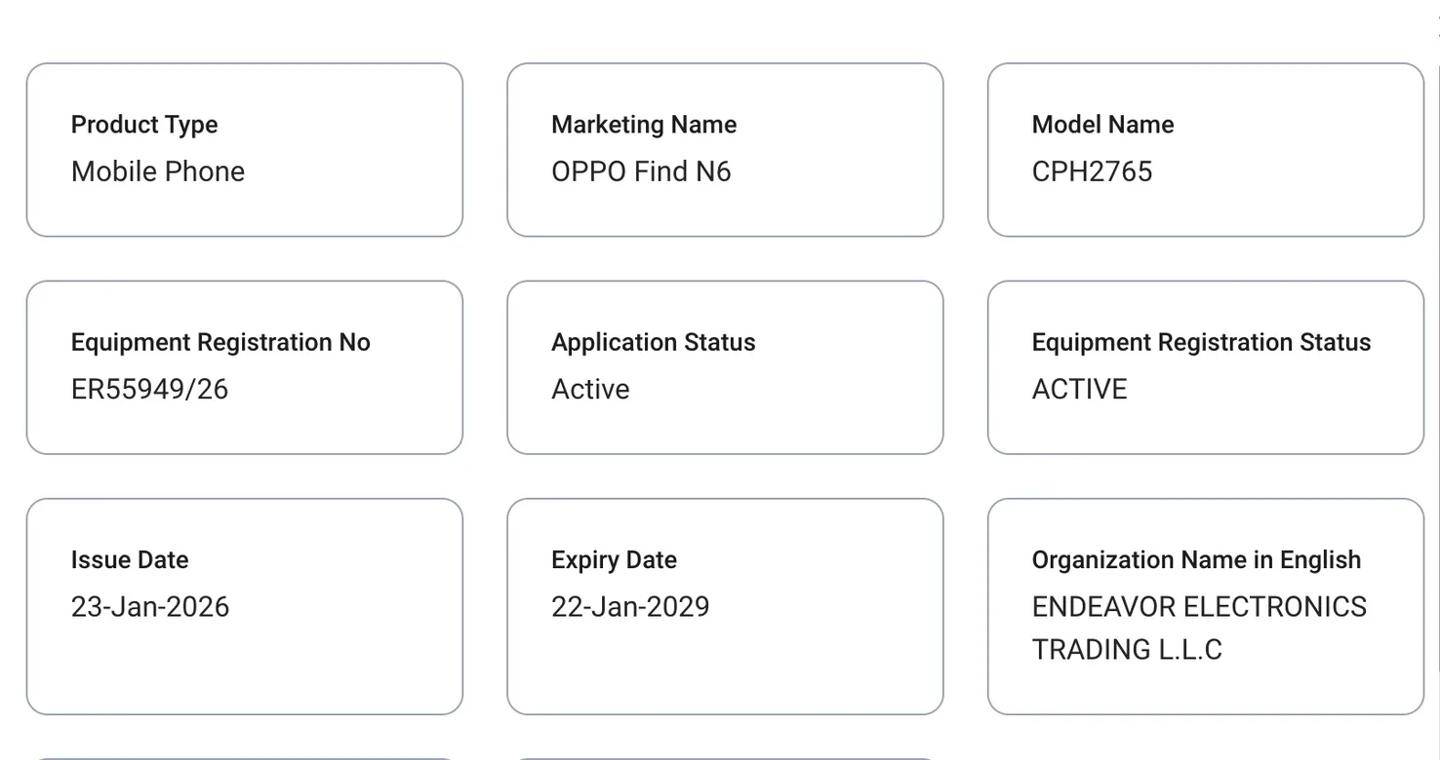 据科技媒体 NoteBook Check 今天报道,OPPO Find N6 折叠屏手机现已出现在多地监管机构的认证数据库中,有望推出全球版本。 据报道,阿联酋电信与数字政府监管局(TRDA)最近出现了一款型号为“CPH2765”的 OPPO 新机,预计型号为 Find N6 全球版。 同时这台手机也出现在新加坡 IMDA(信息通信媒体发展局)数据库中,认证信息显示,这款手机将支持 LTE、5G、Wi-Fi、蓝牙等多种连接方式,还支持 NFC、eSIM 等。 与此同时,Find N6 全球版最近还通过了德国莱茵 TÜV SÜD 认证,支持 80W 有线快充。 结合IT之家此前报道,OPPO Find N6 折叠屏手机已入网,博主 @数码闲聊站 曾透露,OPPO Find N6 的 PLP110 / PLP120 对应普通版 / 北斗卫星通信版,内置 6K 级电池,支持 80W 快充,并配备 2 亿像素镜头 + 多光谱摄像头,拥有 Ai 手写笔配件。 ▲ IT之家实拍:OPPO Find N5