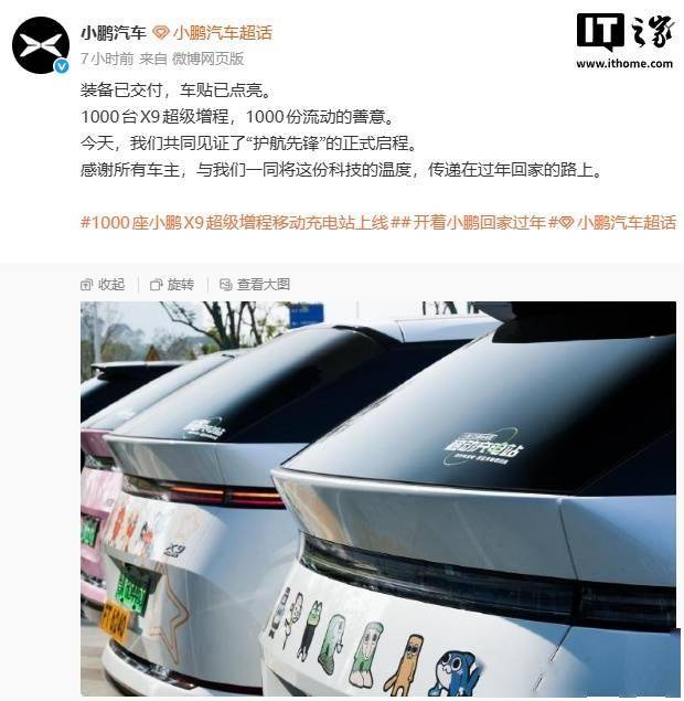 小鹏汽车今日官宣:1000 座小鹏 X9超级增程移动充电站正式上线。在小鹏汽车总部举行的交付仪式上,10 位车主代表接过 V2V 车对车充电线与“移动充电站”专属车贴。 据小鹏汽车官方披露,该计划自 1 月 24 日开放申领以来,1000 套价值 500 元的专业充电设备 48 小时内便被车主抢领完毕。这些“移动充电站”将重点部署在京港澳高速、沪昆高速等返乡主干线的服务区及省际枢纽。 IT之家注意到,小鹏汽车 1 月 19 日宣布,小鹏 X9 超级增程推出「移动充电站」公益合伙人计划,目前已有 1000 位小鹏 X9 先锋车主加入,用户可在春运路上使用 V2V 车对车充电,随时为电量告急的车辆补能。 小鹏 X9 超级增程 MPV 已于去年 11 月正式上市,共 2 款车型,售价区间 30.98-32.98 万元。新车搭载鲲鹏超级增程技术,纯电续航 452 公里,综合续航达 1602 公里。