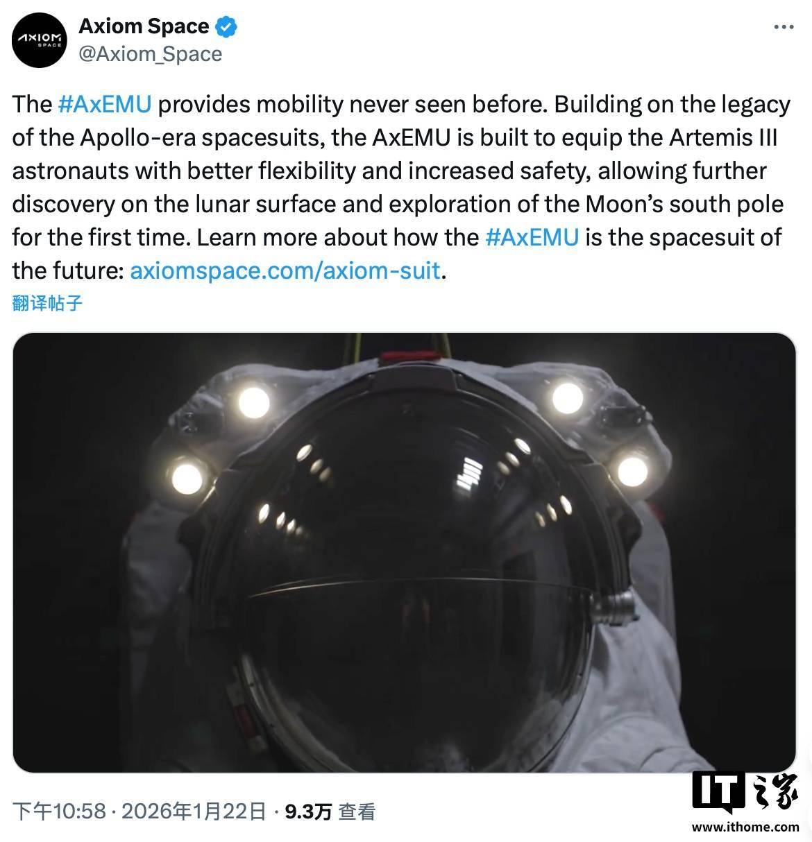 随着 NASA “阿尔忒弥斯二号”载人绕月任务临近,为后续登月计划准备的新一代宇航服研发取得重要进展。Axiom Space 上周发布了一段视频,展示其为 NASA “阿尔忒弥斯三号”任务研发的 AxEMU(舱外机动装置)登月宇航服测试情况。 “阿尔忒弥斯三号”任务计划不早于 2027 年执行,届时将实现自 1972 年以来的首次宇航员登陆月球表面。 据 Axiom Space 在视频说明中强调,“AxEMU 提供了前所未有的机动性”。与阿波罗时代的 A7L 宇航服相比,该款宇航服在关节灵活性上显著增强,使宇航员能够完成深蹲、跪姿、拾取岩石等动作。此外,新宇航服在地球上比旧型号减轻约 9 公斤,能为穿着者带来更轻便的体验。 AxEMU 的单次月面活动支持时间长达 8 小时,得益于新型背包生命维持系统,其在冷却、供气以及食物和水输送方面均进行了升级。 该款宇航服还具备抵御月球南极极端温度的能力,并且能提供更好的月尘防护。Axiom Space 在官方网站中表示,这款宇航服的开发是“推动美国在太空探索领域领导地位、深化对月球及太阳系认知的重要里程碑”。 IT之家查询公开资料获悉,舱外机动装置(Extravehicular Mobility Unit,EMU)是一种独立宇航服,为在地球轨道上执行舱外活动的宇航员提供环境防护、生命维持、移动性和通讯功能支持。该类型宇航服最早于 1982 年使用,是国际空间站使用的两种宇航服之一,NASA 在航天飞机上也使用这种宇航服。