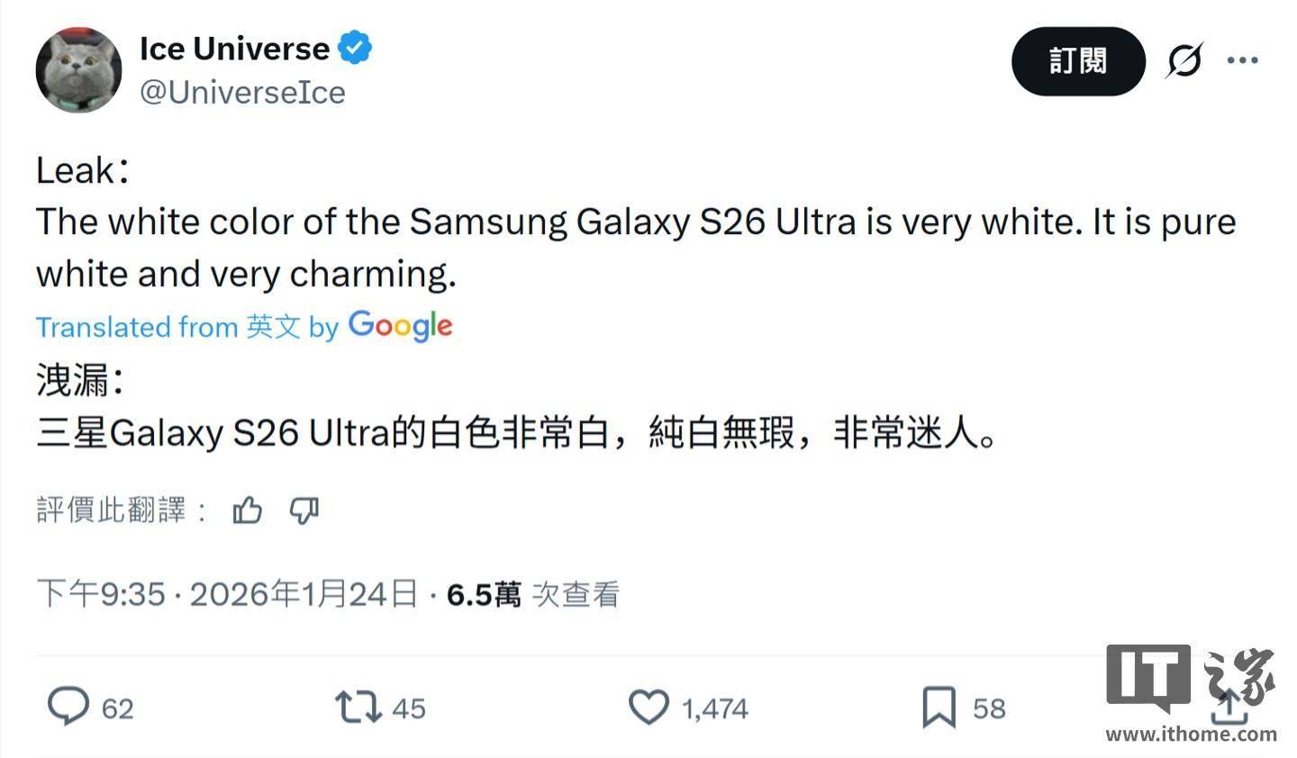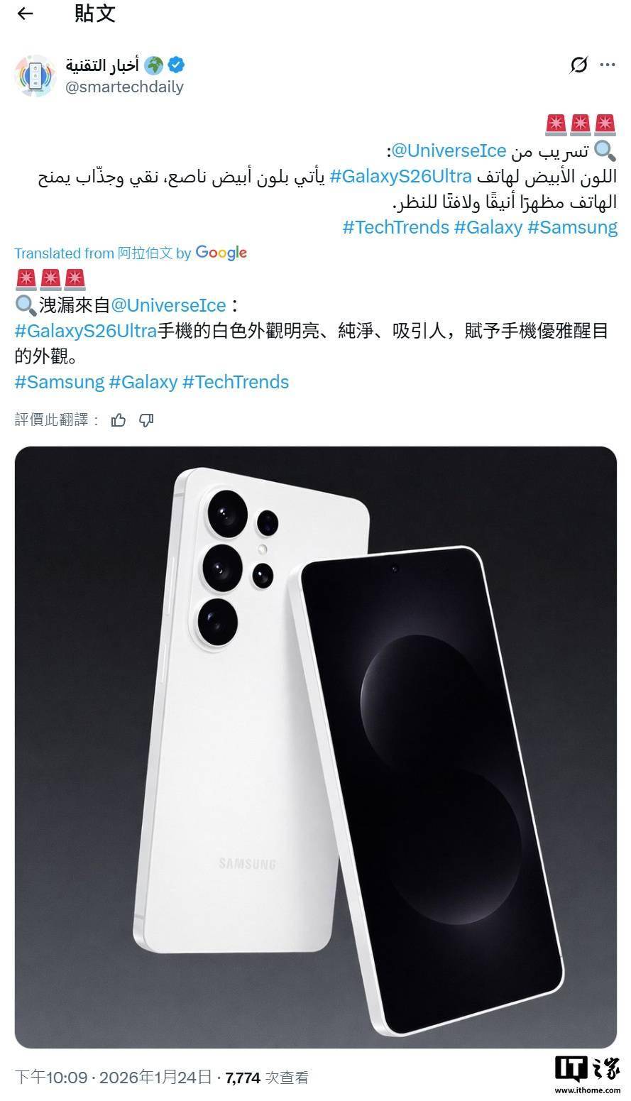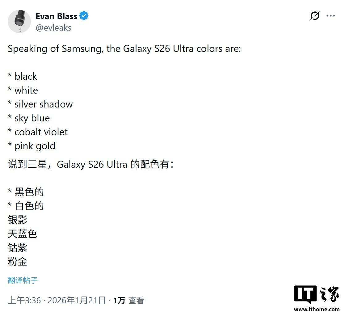 UniverseIce 前天在 X 平台透露,三星 Galaxy S26 Ultra 手机将拥有纯白色版本,“非常迷人”。随后另一位爆料人 Max Jambor 也认同了他的说法,并认为该机的白色配色“非常漂亮”。 同时还有另一名爆料人士制作了 Galaxy S26 Ultra 纯白版的渲染图,展示该机醒目的外观,IT之家附上详情如下: 尽管三星目前尚未公布 Galaxy S26 系列手机的任何细节,但多方泄露信息已经披露了大量内容。目前几乎所有的重要爆料都称 S26 系列机型将提供白色版本,并拥有黑色、天空蓝、钴紫等配色,同时三星官方商城还可能会出售银影色和粉金色。 结合IT之家此前报道,消息源 @UniverseIce 曾透露 Galaxy S26 Ultra 将装备新一代“超高强度”大猩猩玻璃,有望让用户彻底告别“贴膜时代”,无需安装第三方钢化膜就能保护屏幕。