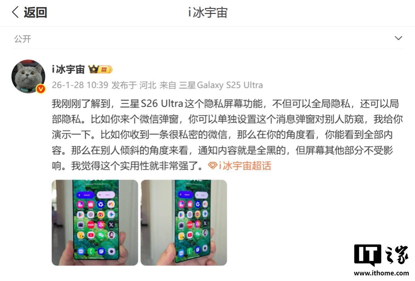 三星公司今天(1 月 28 日)发布博文,预告“隐私保护层”(Privacy Layer)显示技术,预估将成为 Galaxy S26 系列手机的核心卖点首发。 IT之家附上博文中相关视频如下: 名称方面,三星新闻稿并未公布具体营销名称,但相关描述和此前 One UI 8.5 系统代码泄露的“隐私显示”(Privacy Display)功能吻合。 这项历经五年研发的技术,旨在解决公交、电梯或咖啡厅等场景下的“肩窥”(Shoulder Surfing)问题,即旁人越过肩膀偷看屏幕。 传统的解决方案通常是贴一张物理防窥膜,但这会导致屏幕永久变暗并牺牲可视角度。相比之下,三星的新方案通过硬件与软件的深度协同,可动态调节屏幕可视范围。 系统能在像素级别控制光线传播方向,确保只有正对屏幕的用户能清晰看到内容,而旁人只能看到模糊或黑屏画面。 在灵活性方面,该技术不再是简单的“全开或全关”,用户既可以手动调整防窥强度,也能设置仅在特定 App(如银行或聊天软件)中自动激活。 更智能的是,系统能自动识别敏感场景,例如在输入 PIN 码、密码或接收弹窗通知时瞬间收窄可视角度,保护关键信息不被旁人瞥见。 此外消息源 @i冰宇宙 还透露: 我刚刚了解到,三星 S26 Ultra 这个隐私屏幕功能,不但可以全局隐私,还可以局部隐私。比如你来个微信弹窗,你可以单独设置这个消息弹窗对别人防窥,我给你演示一下。 比如你收到一条很私密的微信,那么在你的角度看,你能看到全部内容。那么在别人倾斜的角度来看,通知内容就是全黑的,但屏幕其他部分不受影响。我觉得这个实用性就非常强了。