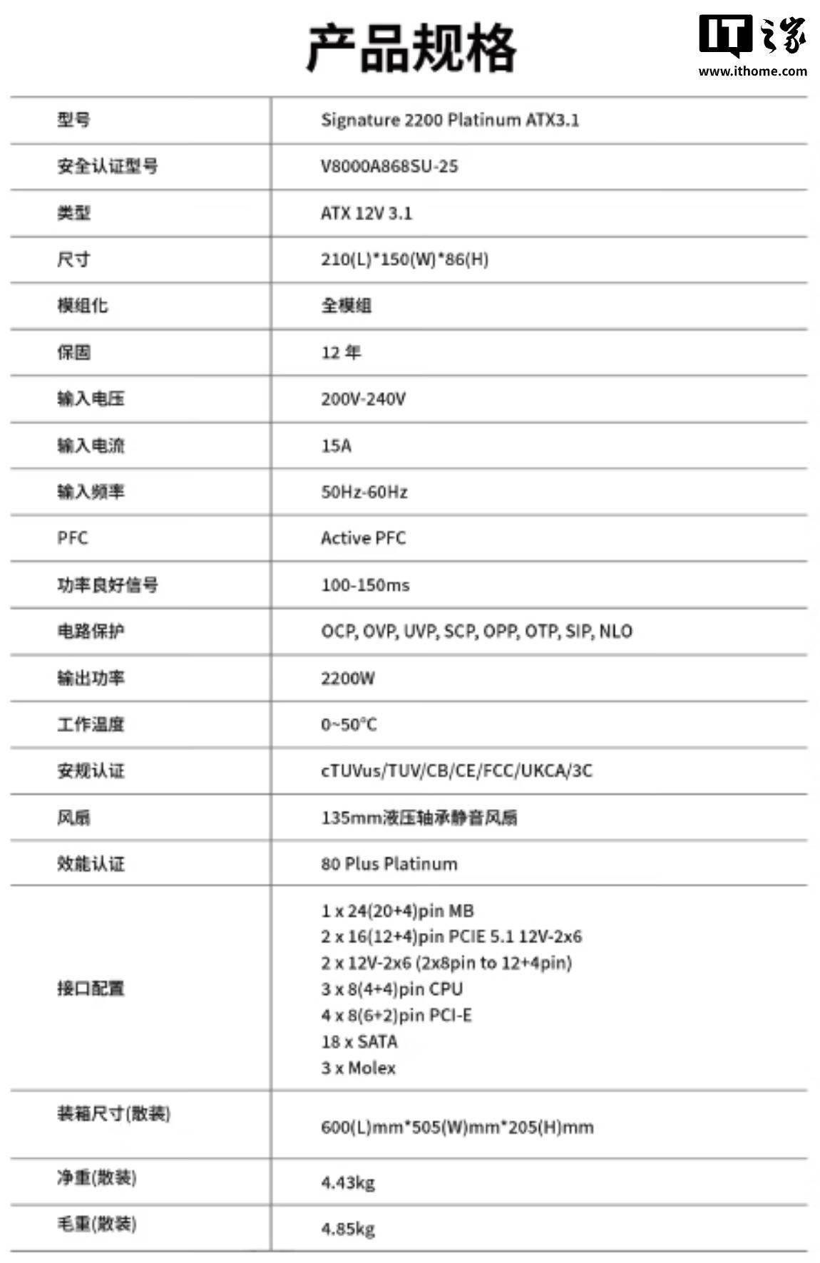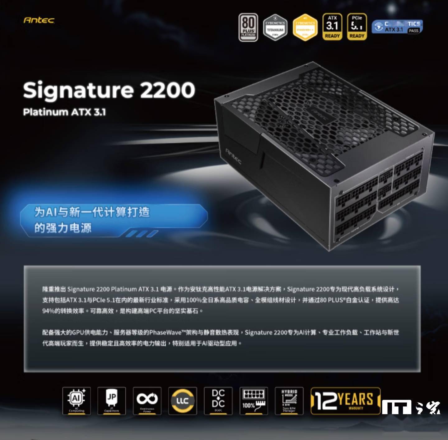 IT之家 1 月 28 日消息,安钛克现已在京东上架 Signature Platinum 2200W 全模组电源,该产品采用 ATX 3.1 及 PCIe 5.1 标准打造,通过 80PLUS 以及 Cybenetics 白金效能认证,定价为 3799 元。 该电源整体尺寸为 210x150x86mm,内置 135mm FDB 静音风扇,使用全桥 LLC 谐振 + 同步整流 +DC-DC 拓扑“服务器级 PHASEWAVE 架构”,匹配全日系电容。 该电源提供两个原生 12V-2x6 接口以及 9 个 CPU&PCIE 模组接口,配备了 4 条 PCI-E 线材、2 条 16Pin 转双 8Pin 线材和 2 条原生 12V-2x6 线材,IT之家附产品参数: