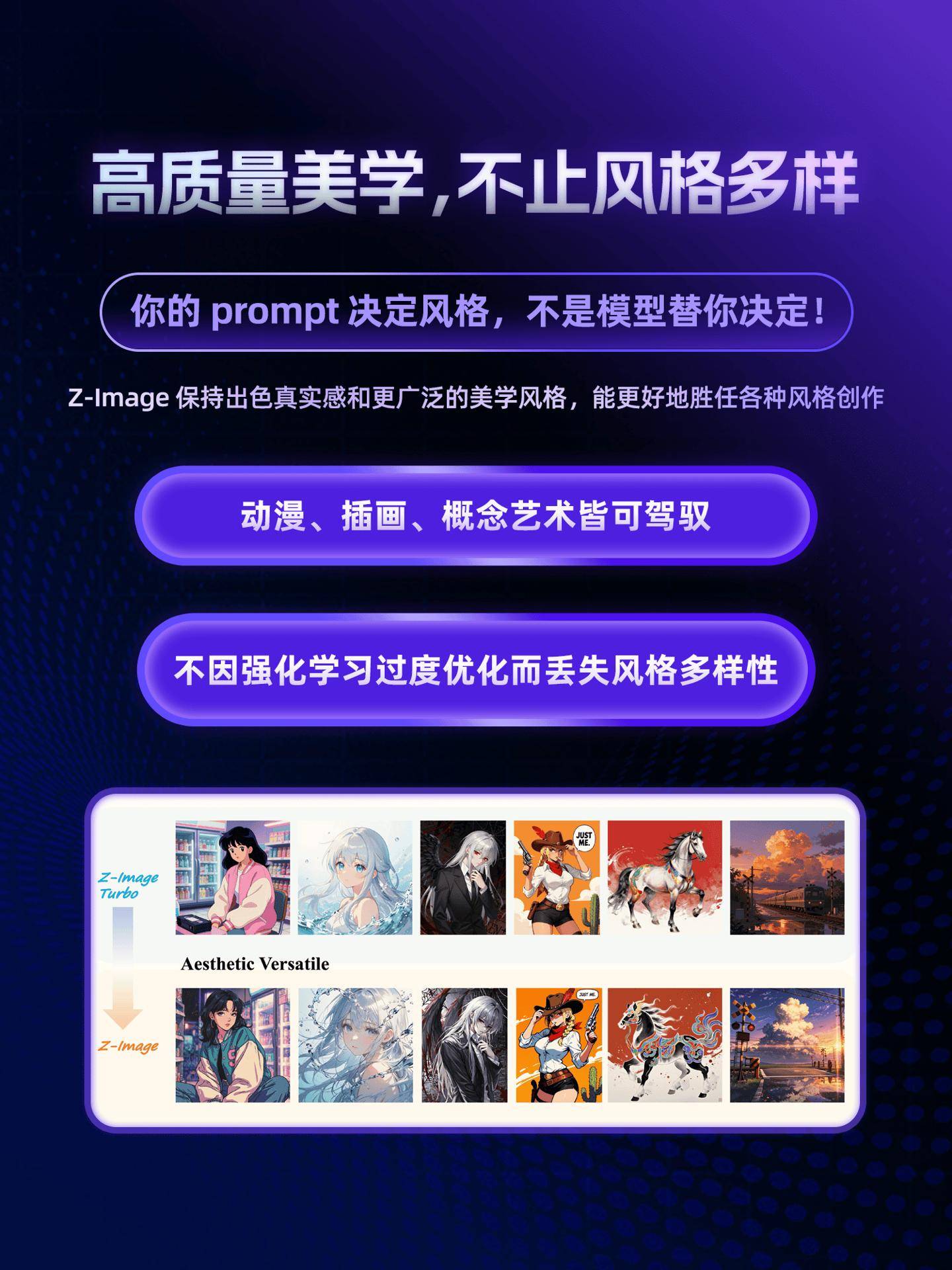 阿里云通义今日(1 月 28 日)正式开源发布 Z-Image 基座模型。 该模型尺寸为 6B,为非蒸馏基座模型,保留全量权重分布,原生支持 CFG 引导机制,为 LoRA、ControlNet 等微调任务提供训练底座。 Z-Image 宣称打破单一维度的写实局限:无论是追求光影的 Photorealism,还是具有情绪张力的动漫与数字艺术,Z-Image 均能捕捉并重构每一处风格细节。 Z-Image 采用非蒸馏基座架构,保留全量权重分布,原生支持 CFG 引导机制,为 LoRA、ControlNet 等微调任务提供训练底座。 此外,Z-Image 专项优化了生成“同质化”痛点:优化采样空间分布,确保不同原生出图的面孔与构图具备显著差异;多人场景剥离个体特征,拒绝 AI “大众脸”。 Z-Image 还可灵敏响应负向提示词,通过 Negative Prompt 快速过滤瑕疵、净化画面,实现从构图到光影的深度掌控。 IT之家附 Z-Image 开源地址如下: