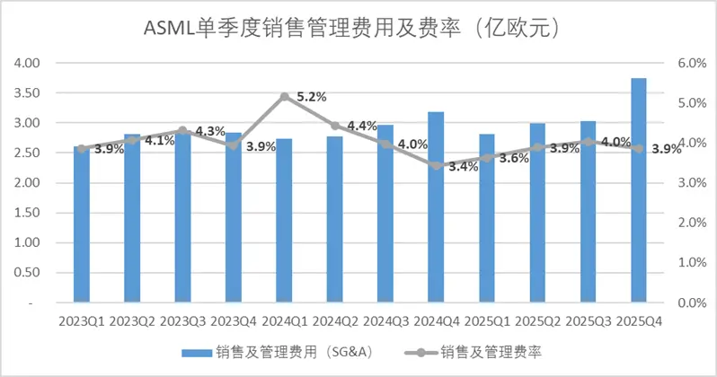 但是如果结合收入来看,其实整体的费率明显摊薄,今年四季度ASML的销售管理费率为3.9%;研发费率为13%,同比增长都不到100个基点,环比更是分别下降了17、177个基点。