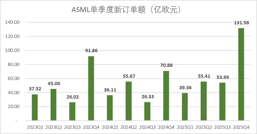 但显然下游客户,乃至整个AI行业的Infra预期要狂热的多,四季度ASML的新订单额达到了恐怖的131.58亿欧,不仅连续两个季度同比接近翻倍,更是比大摩的“乐观”预期还要高出80%。
