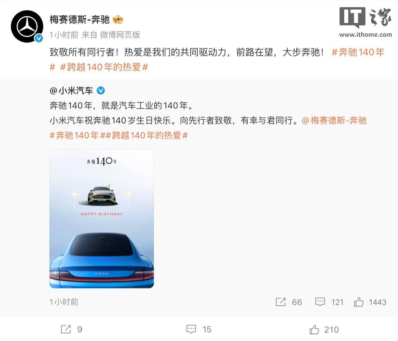 小米汽车:奔驰 140 年,就是汽车工业的 140 年。小米汽车祝奔驰 140 岁生日快乐。向先行者致敬,有幸与君同行。 奔驰回复:致敬所有同行者!热爱是我们的共同驱动力,前路在望,大步奔驰!