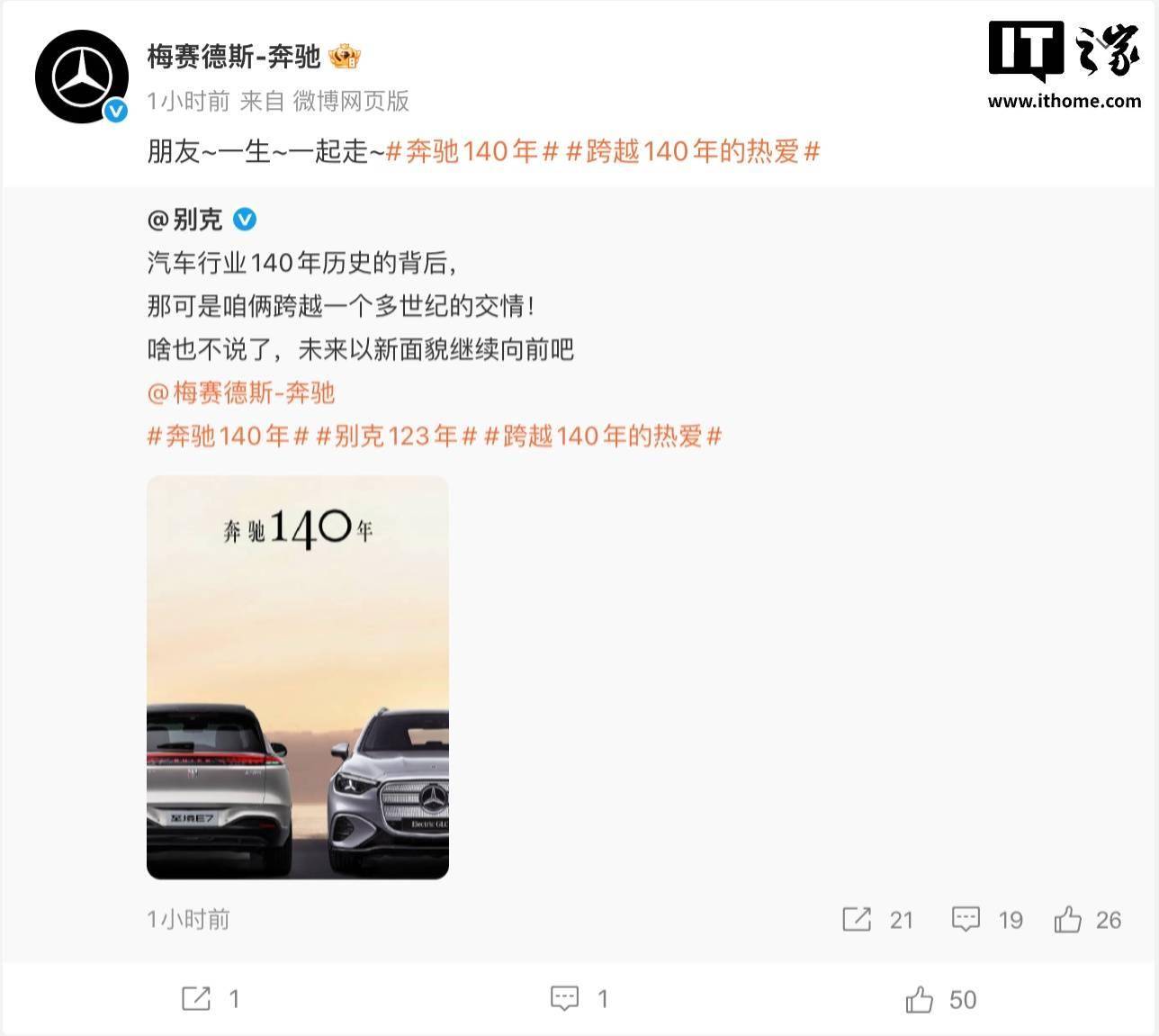 别克:汽车行业 140 年历史的背后,那可是咱俩跨越一个多世纪的交情! 奔驰回复:朋友 ~ 一生 ~ 一起走 ~