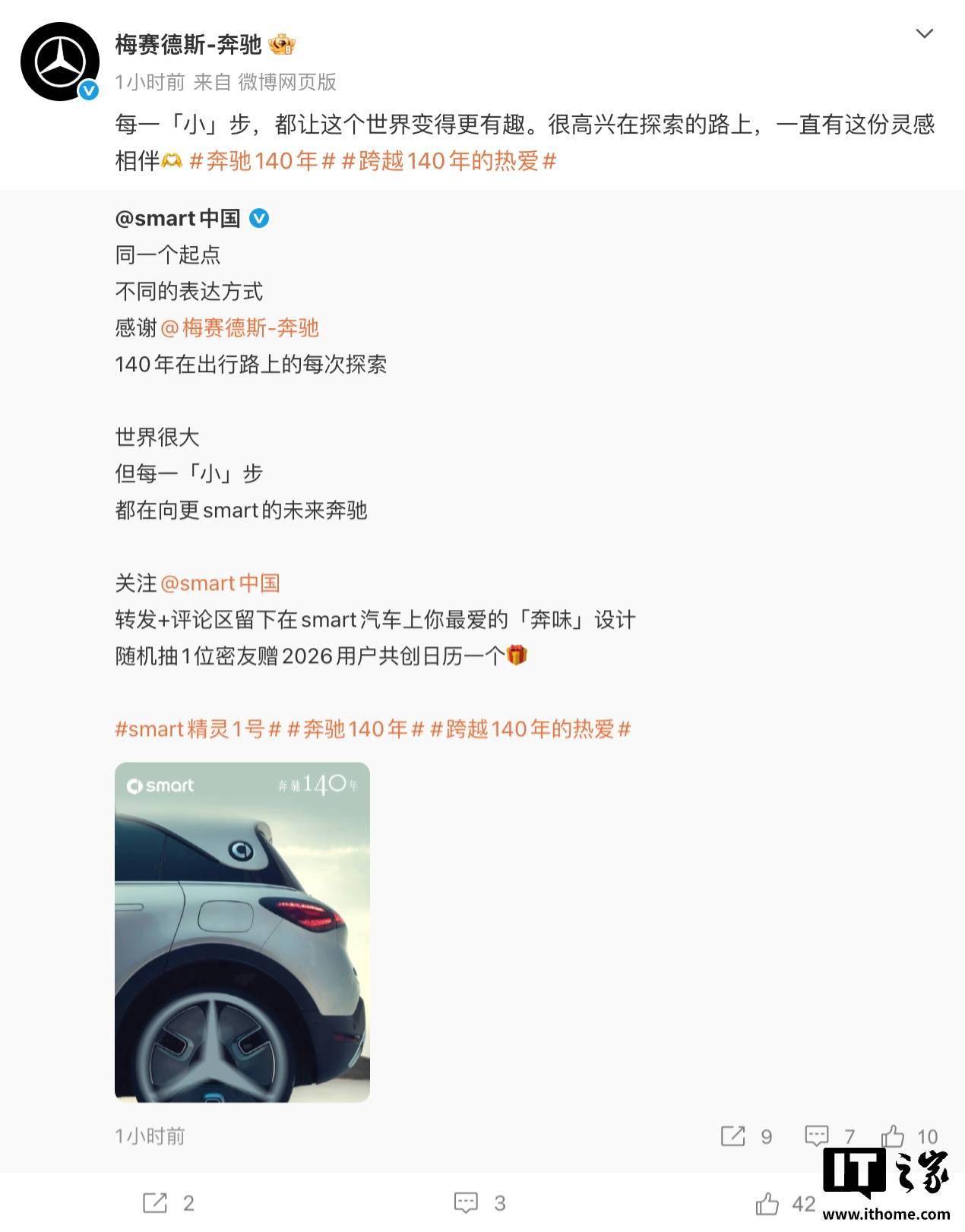 smart 中国:感谢 @梅赛德斯-奔驰 140 年在出行路上的每次探索。世界很大,但每一「小」步都在向更 smart 的未来奔驰。 奔驰回复:每一「小」步,都让这个世界变得更有趣。很高兴在探索的路上,一直有这份灵感相伴。