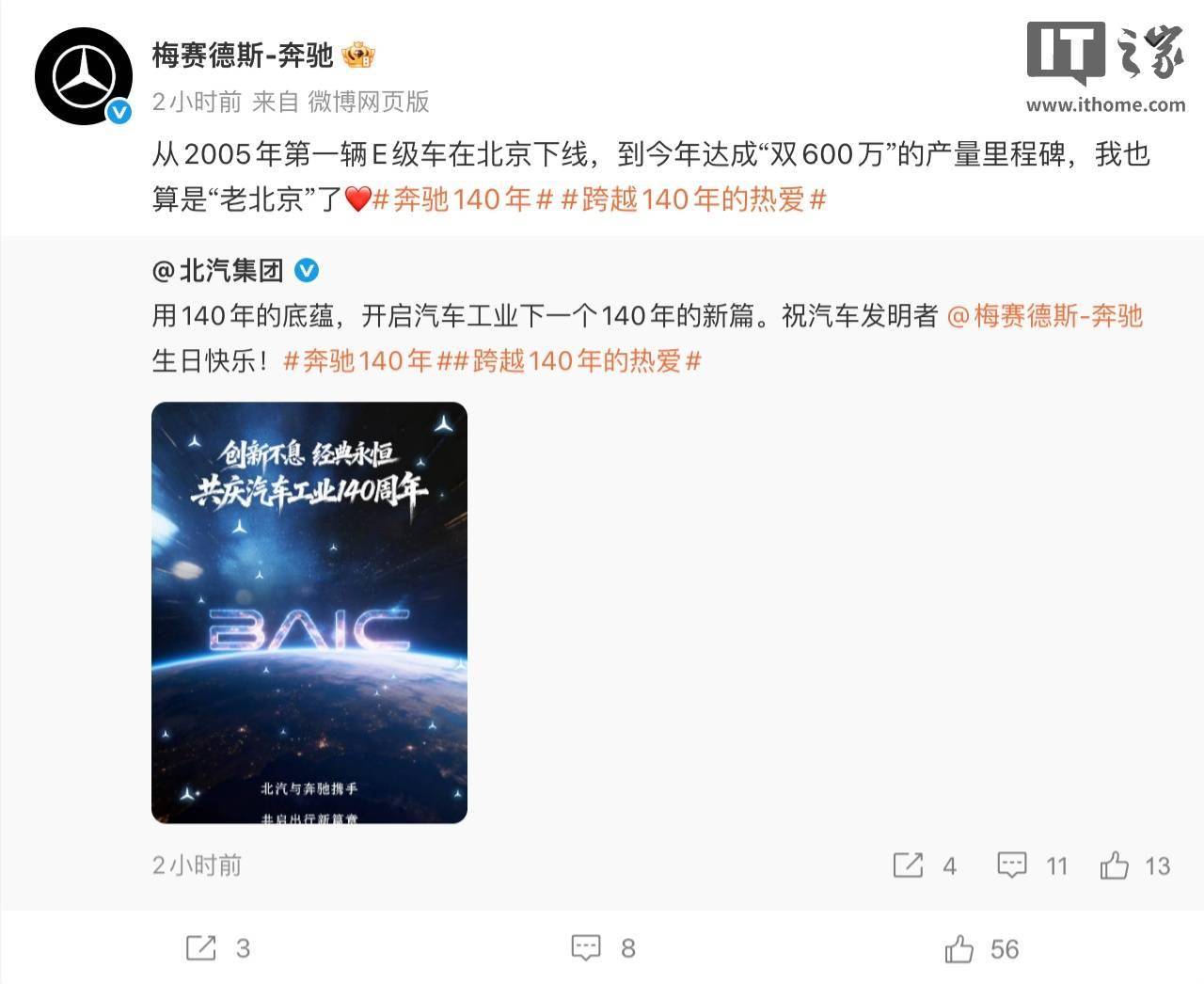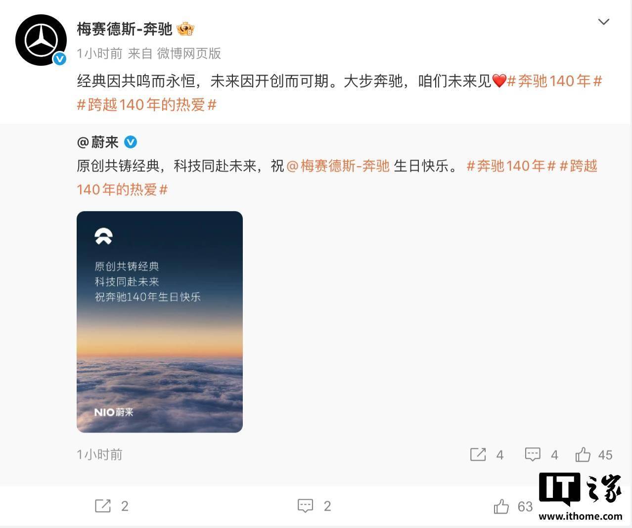 蔚来:原创共铸经典,科技同赴未来,祝 @梅赛德斯-奔驰 生日快乐。 奔驰回复:经典因共鸣而永恒,未来因开创而可期。大步奔驰,咱们未来见。