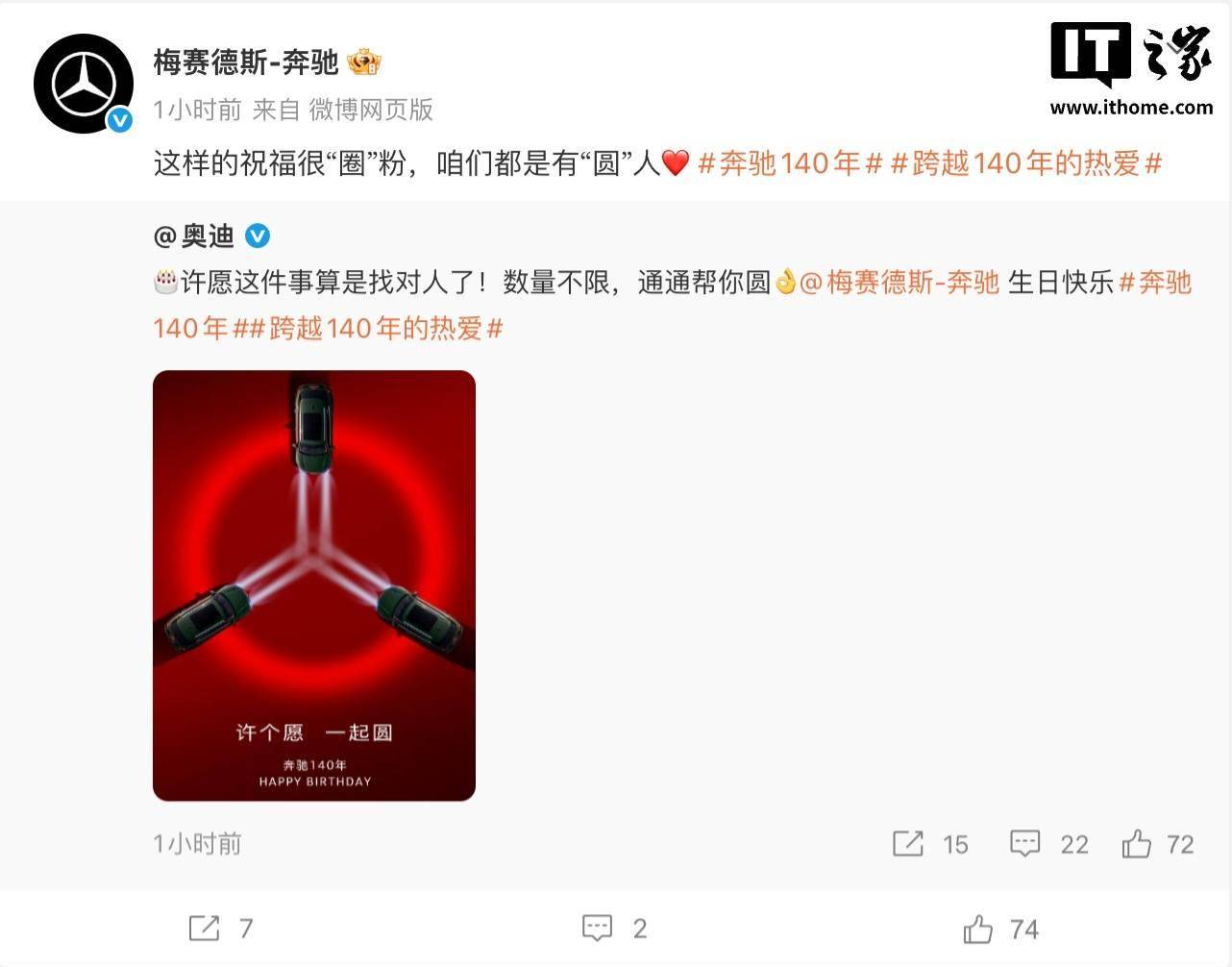 奥迪:许愿这件事算是找对人了!数量不限,通通帮你圆。 奔驰回复:这样的祝福很“圈”粉,咱们都是有“圆”人。