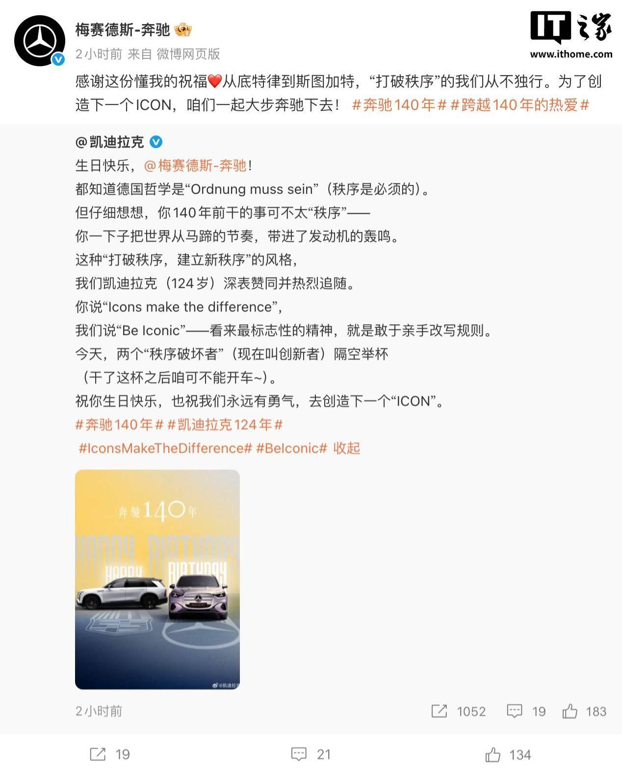 凯迪拉克:都知道德国哲学是“Ordnung muss sein”(秩序是必须的)。但仔细想想,你 140 年前干的事可不太“秩序”—— 你一下子把世界从马蹄的节奏,带进了发动机的轰鸣。这种“打破秩序,建立新秩序”的风格,我们凯迪拉克(124 岁)深表赞同并热烈追随。 奔驰回复:从底特律到斯图加特,“打破秩序”的我们从不独行。为了创造下一个 ICON,咱们一起大步奔驰下去!