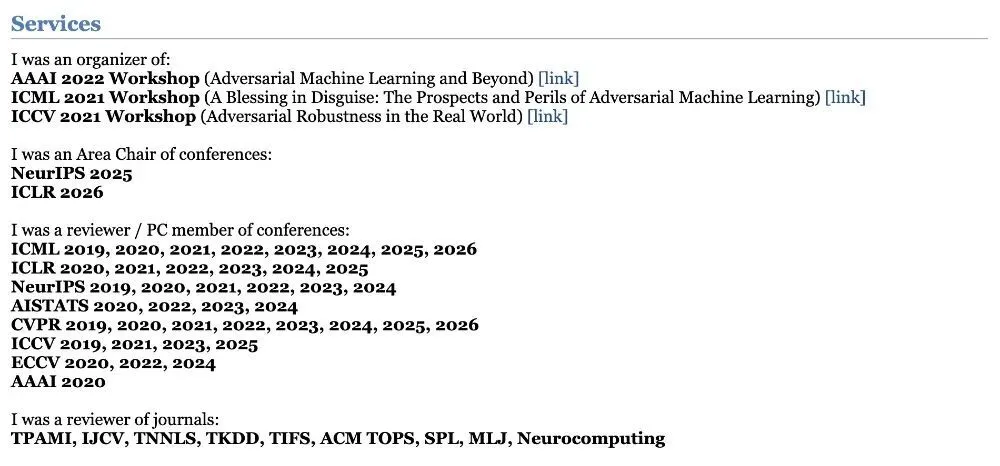 他参与的团队在包括NIPS 2017以及GeekPwn 2018在内的多个对抗攻防竞赛中均获得第一名。此外庞天宇多次担任ICML、NeurIPS、ICLR、CVPR、ICCV、ECCV、TPAMI等顶级国际会议和期刊的审稿人。