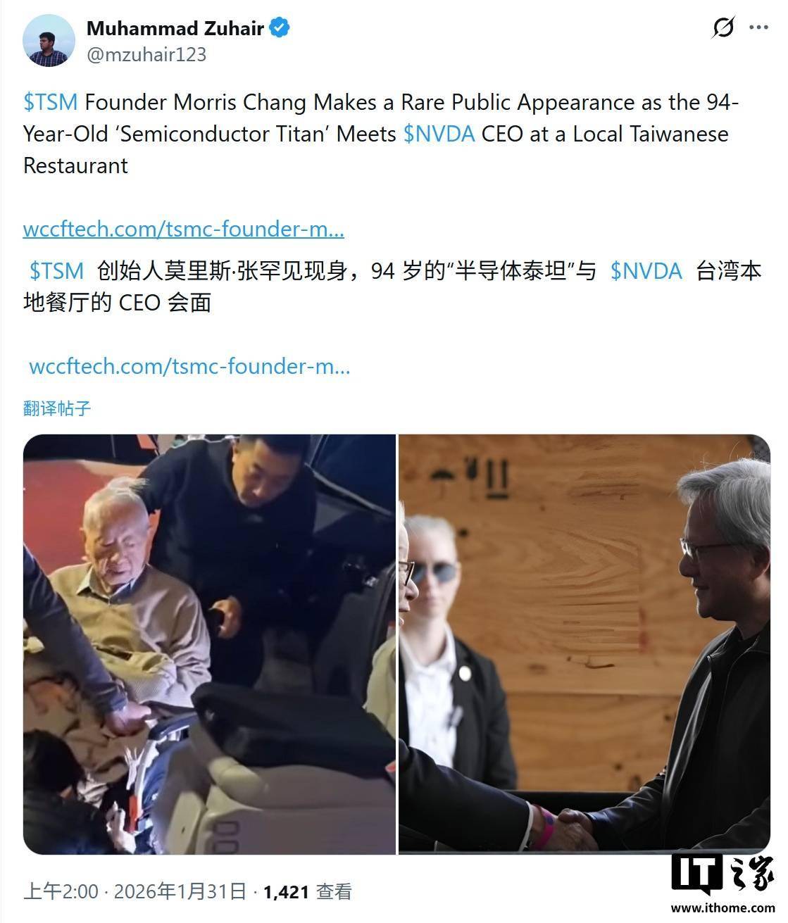 科技媒体 Wccftech 昨日(1 月 30 日)发布博文,报道称英伟达 CEO 黄仁勋在台北某餐厅,与 94 岁高龄的台积电创始人张忠谋会面。 报道称 94 岁的张忠谋在台北某餐厅现身,虽然因健康原因需依靠轮椅出行,但他精神矍铄,与黄仁勋相谈甚欢。这也是这位被誉为“半导体教父”的传奇人物,在沉寂一年多后的首次公开亮相。IT之家附上相关图片如下: 黄仁勋与张忠谋的私交已延续数十年,在英伟达还只是一家初创小厂时,黄仁勋曾向张忠谋许诺,英伟达终将成为台积电最大的客户。 更有趣的一段往事是,张忠谋曾有意邀请黄仁勋出任台积电 CEO 一职,但最终被婉拒。如今,台积电已成为英伟达 AI 芯片制造不可或缺的基石,两人当年的承诺与互动,已成为科技史上的一段佳话。