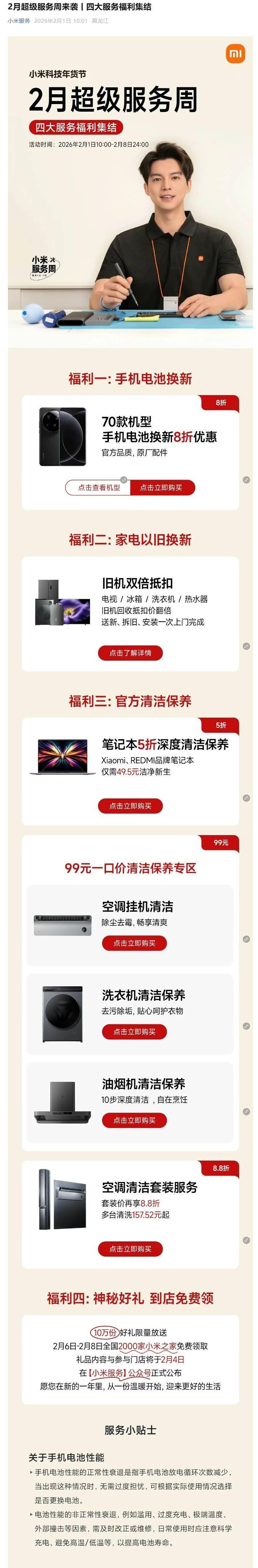 IT之家 2 月 1 日消息,小米 2 月超级服务周今日开启,70 款手机电池换新 8 折,活动时间 2026 年 2 月 1 日 10:00-2 月 8 日 24:00。 70 款手机电池换新 8 折: 小米官方提到,手机电池性能的正常性衰退是指手机电池放电循环次数减少,当出现这种情况时,无需过度担忧,可根据实际使用情况选择是否更换电池。 电池性能的非正常性衰退,例如滥用、过度充电、极端温度外部撞击等因素,需及时改正或维修,日常使用时应注意科学充电、避免高温 / 低温等,以提高电池寿命。 IT之家注意到,小米推出了笔记本 5 折深度清洁保养,小米 / REDMI 系列笔记本仅需 49.5 元(原价 99 元);小米空调挂机深度清洁一口价 99 元(原价 119 元),洗衣机清洁保养一口价 99 元(原价 119 元),油烟机清洁保养 99 元(原价 169 元);空调清洁套装价再享 8.8 折,多台清洗 157.52 元起。 此外,该服务周还在家电以旧换新方面带来了福利,电视 / 冰箱 / 洗衣机 / 热水器旧机回收抵扣价翻倍,送新、拆旧、安装一次上门完成。