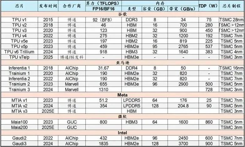 谷歌已深耕 TPU 十年,前文已有详细讨论;其他北美大厂则是近两年加速跟上,动作开始变大。