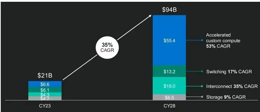 出货量激增将同步带动市场规模扩容,AI 用 ASIC 有望快速成长为千亿美金赛道(对应单颗价值 1 万美元左右,仅为英伟达 GPU 的 1/5-1/10)。作为大厂 ASIC 核心合作方,博通给出更乐观预期:2027 年大客户 ASIC 可服务市场将达 600-900 亿美元;Marvell 也预测,2028 年定制芯片将占数据中心加速计算市场 25% 的份额。