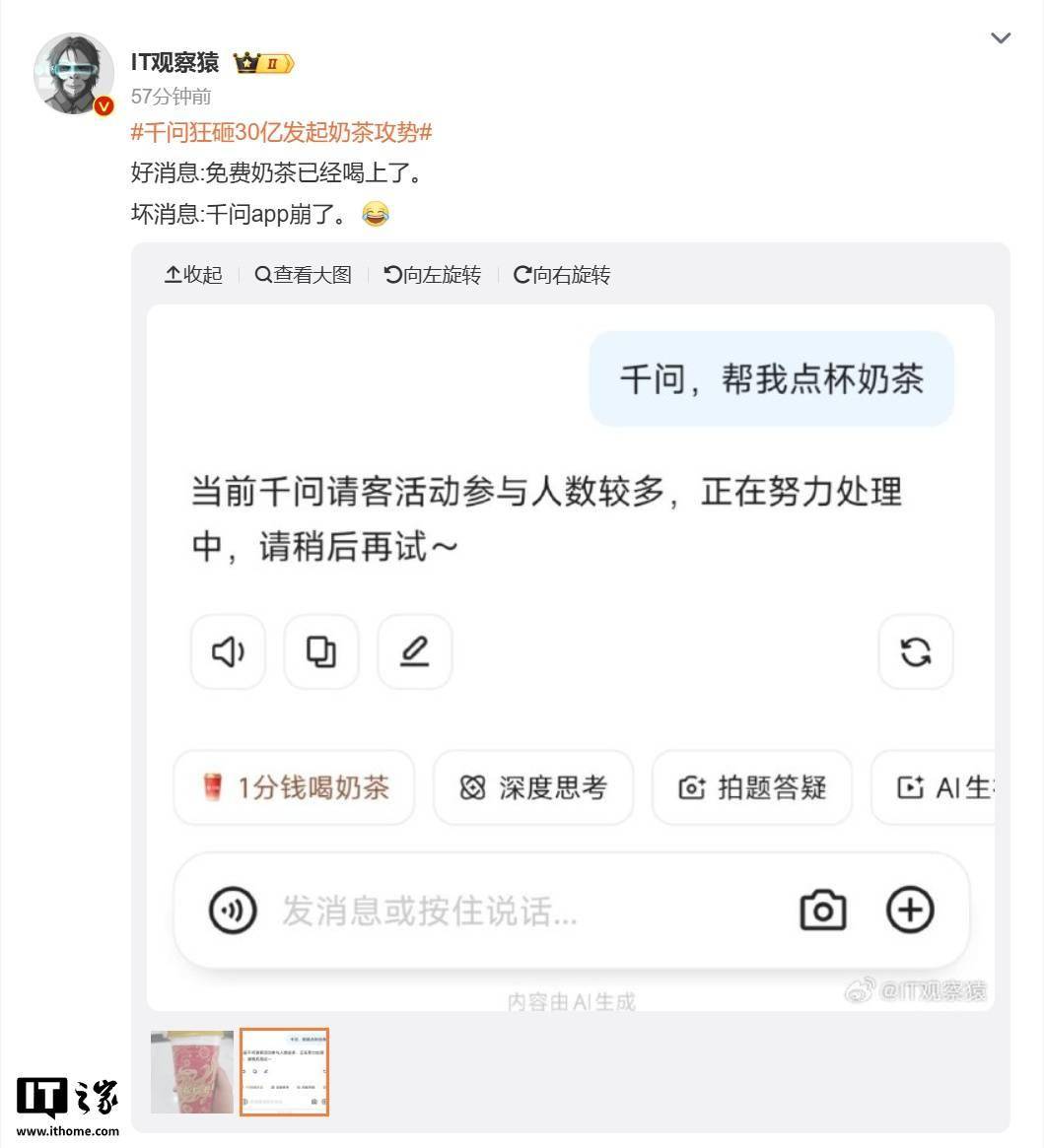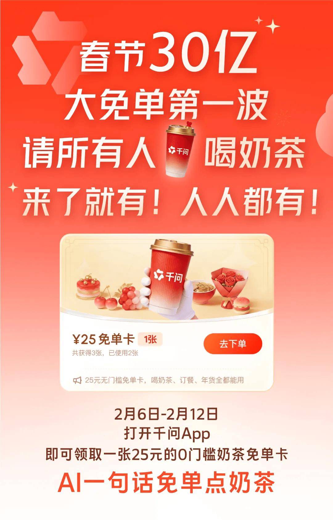 阿里千问官方今天在微博发文,回应“免单送奶茶太火爆”话题。 千问表示,他们正在紧急加资源,全力保障顺畅,请大家“稍稍等待”。 结合阿里巴巴公众号今早发文,千问 App 今天开启第一波“春节 30 亿大免单”活动,所有用户只需要将千问 App 更新到最新版,打开就能领取 25 元无门槛免单卡,能够免费喝奶茶,也能够通过淘宝闪购买年货、点外卖,并且 App 还能够“一句话免单点奶茶”,只需输入“千问帮我点奶茶”提示词就行。 随后这一活动很快登上微博热搜榜,截至IT之家发稿排名第四,许多网友纷纷发文表示,虽然喝上了免费奶茶,但是千问 App“崩了”,有概率无法点单 / 下单。