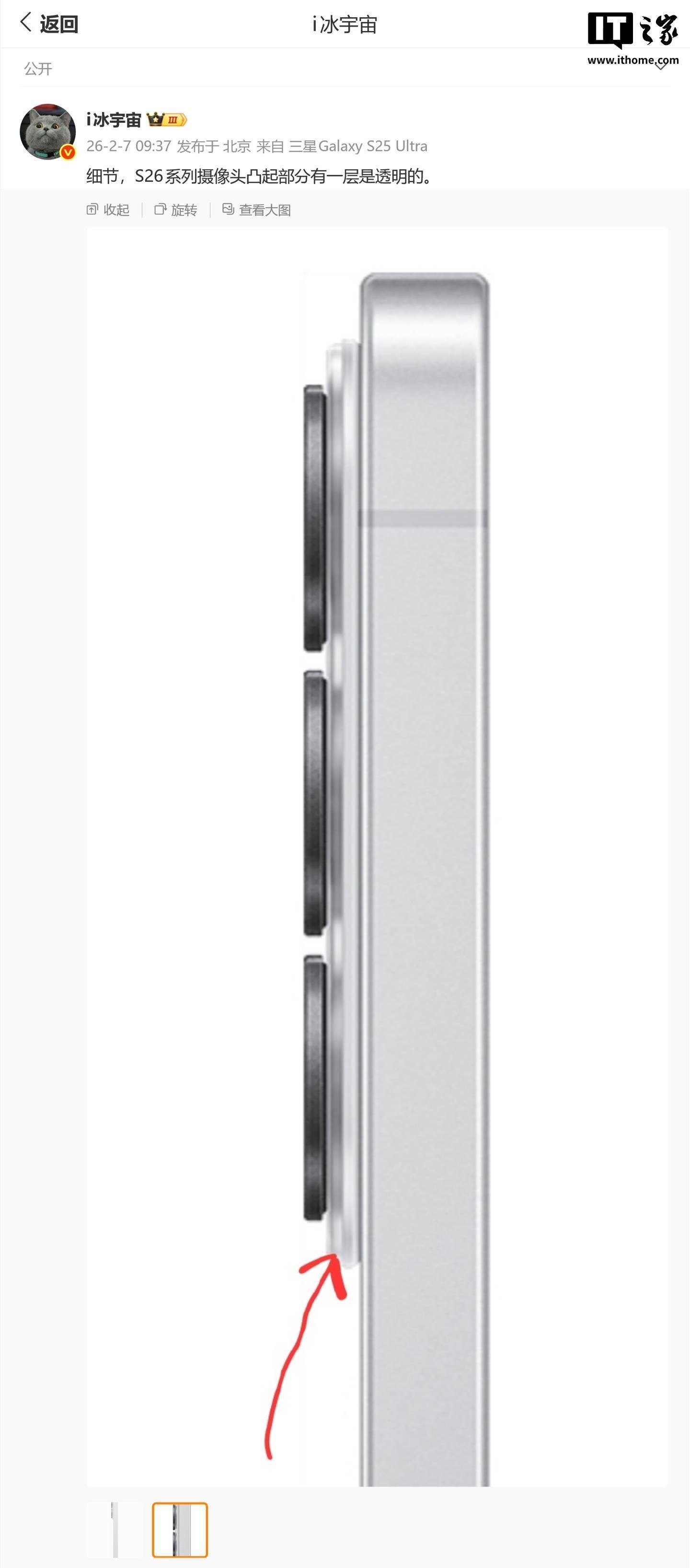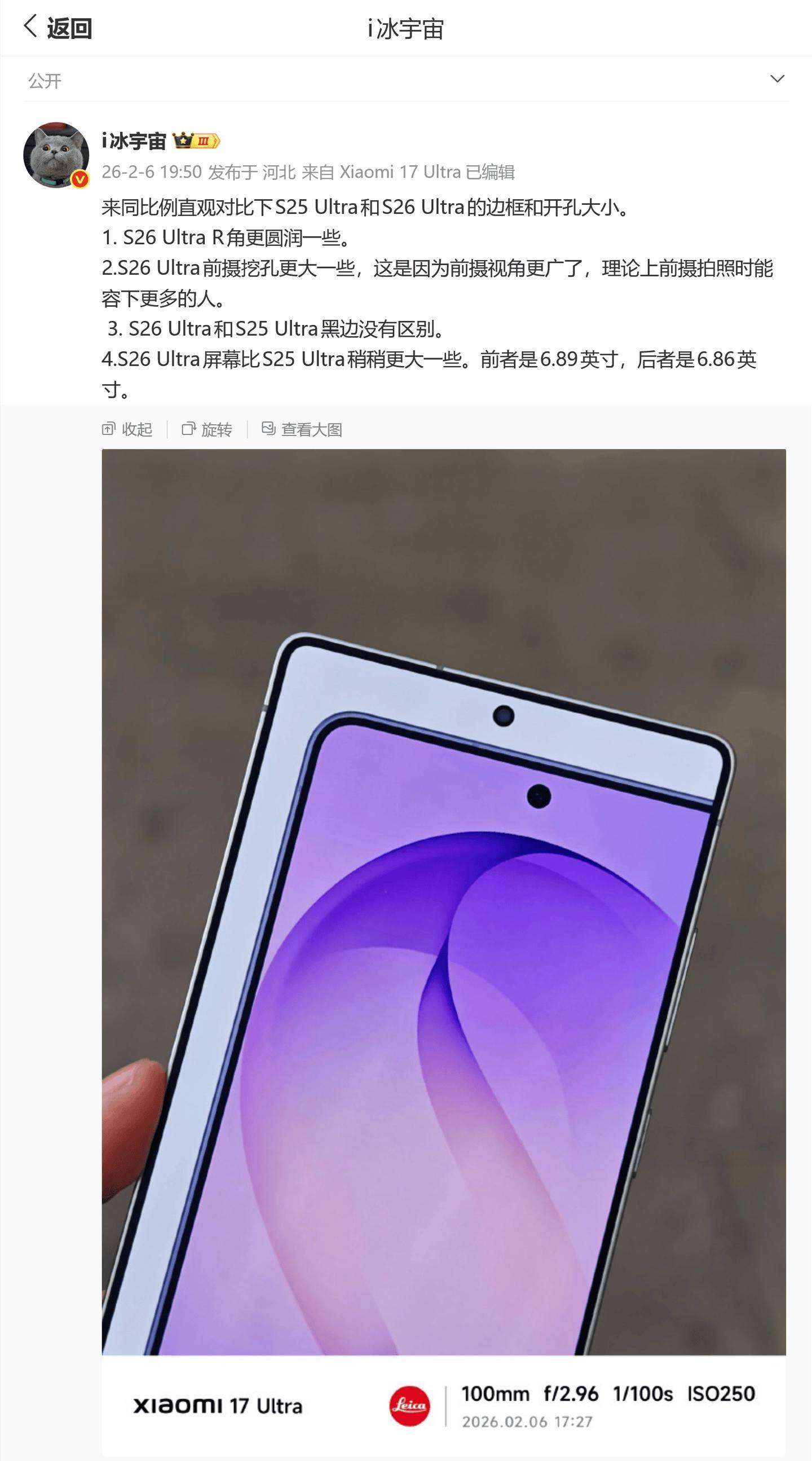 i冰宇宙 昨日(2 月 6 日)发布微博,分享了一张图片,同比例直观对比三星 Galaxy S25 Ultra 和 S26 Ultra 的边框和开孔大小。 IT之家援引博文内容如下: - S26 Ultra R 角更圆润一些。